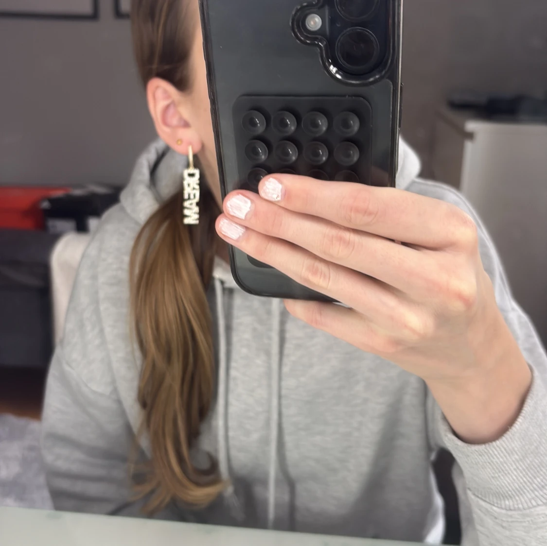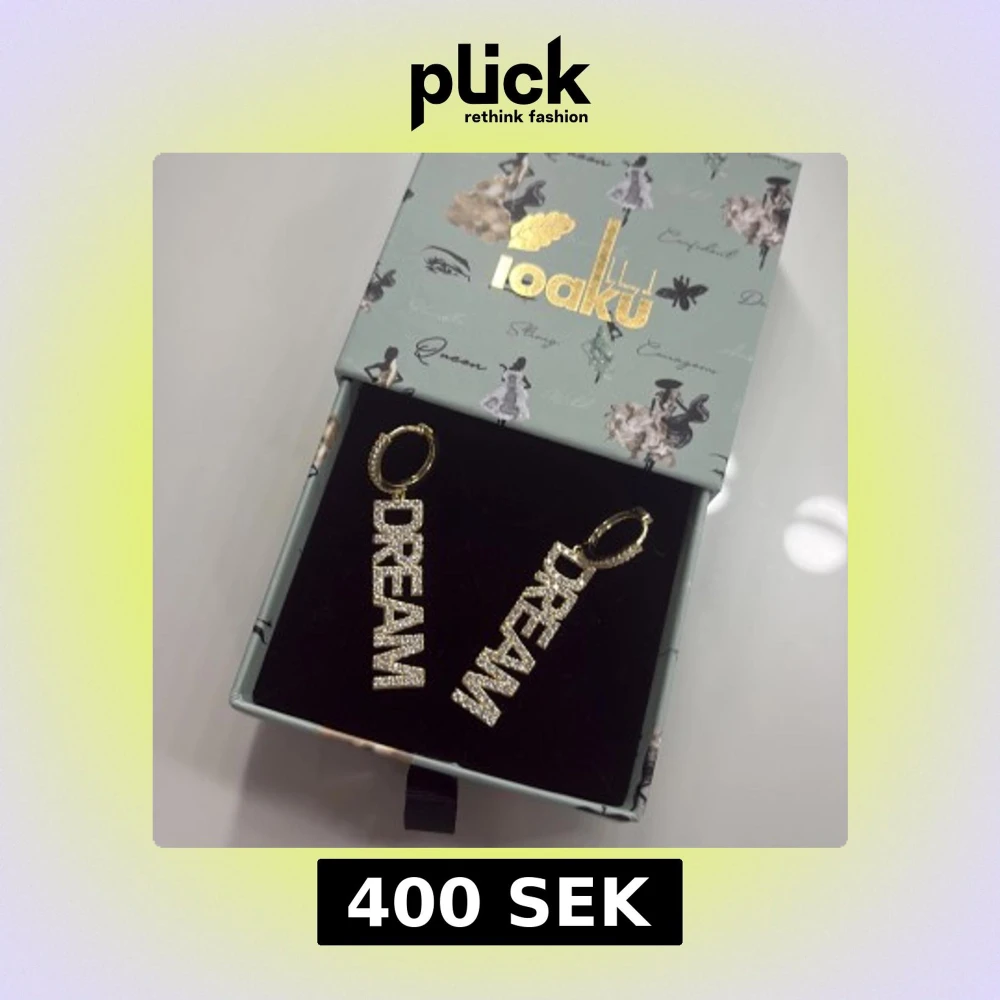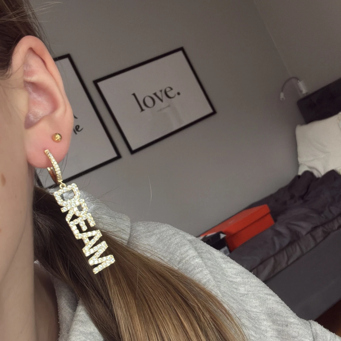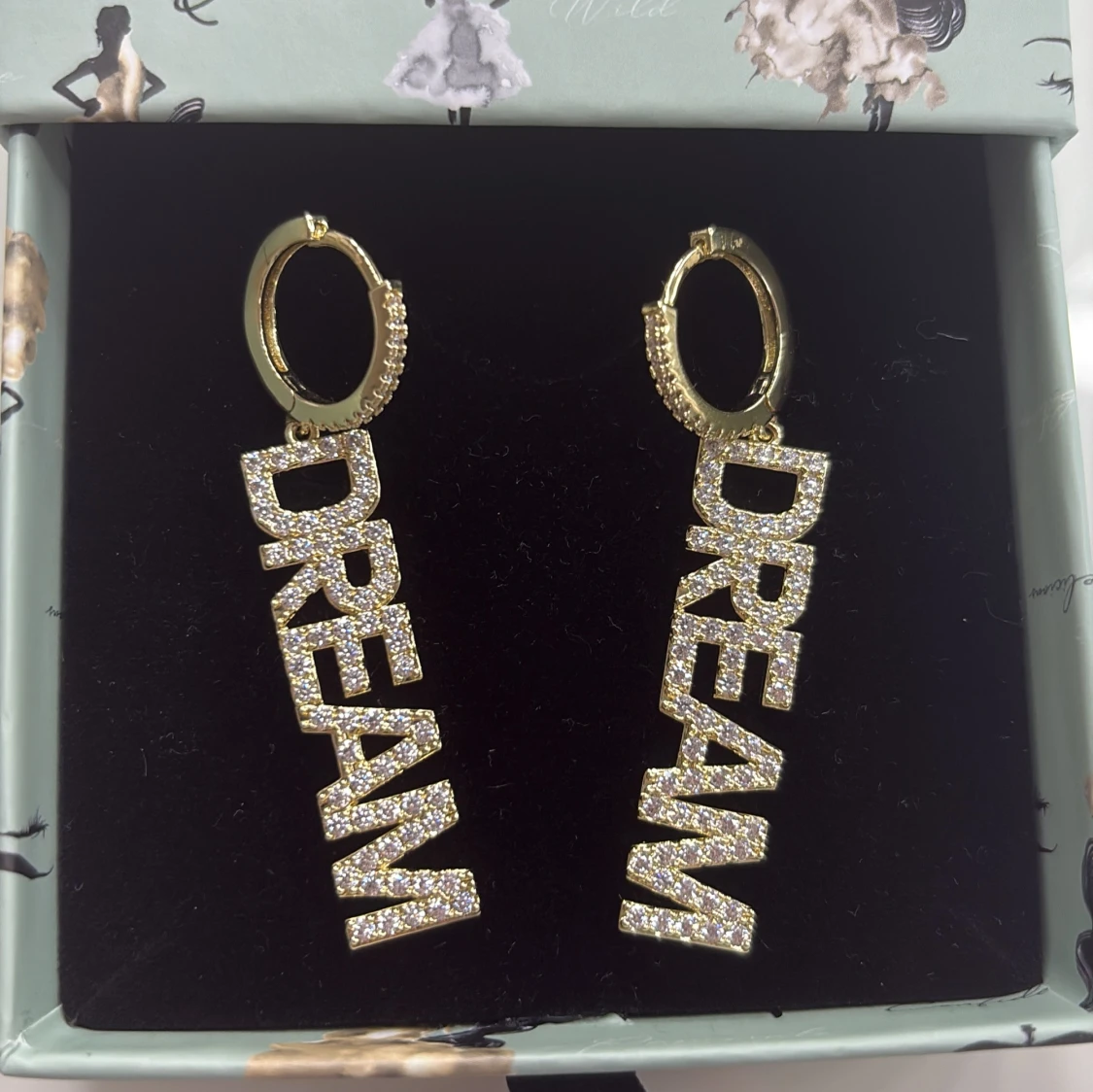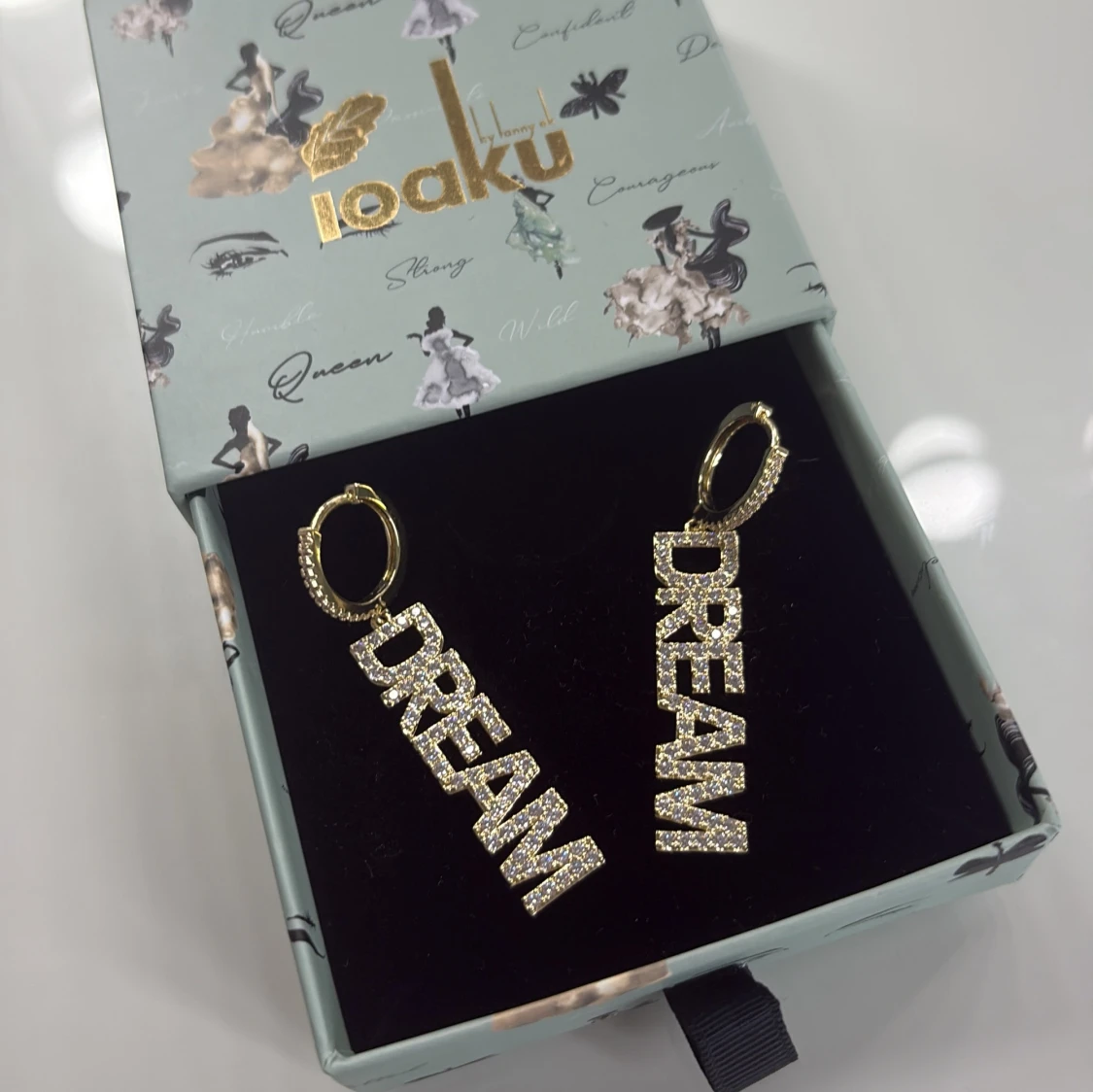 Statementörhängen från Ioaku i guld med hängande texten 'DREAM' täckt av gnistrande stenar. Bokstäverna är stora och tydliga, och örhängena har en lyxig vibe med sin glittriga finish. Perfekta för dig som vill sticka ut och sprida good vibes.
