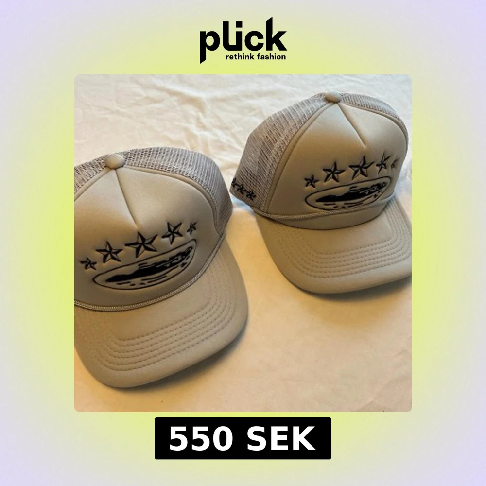Säljer en beige truckerkeps Corteiz med svart broderad stjärndesign och mesh på sidorna. Kepsen har justerbar snapback och logga på insidan. Perfekt för dig som vill ha en clean och trendig look.