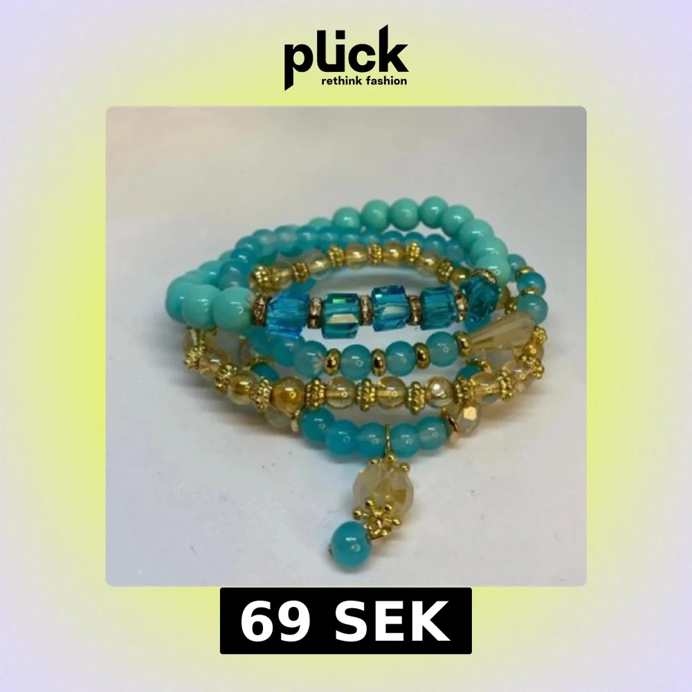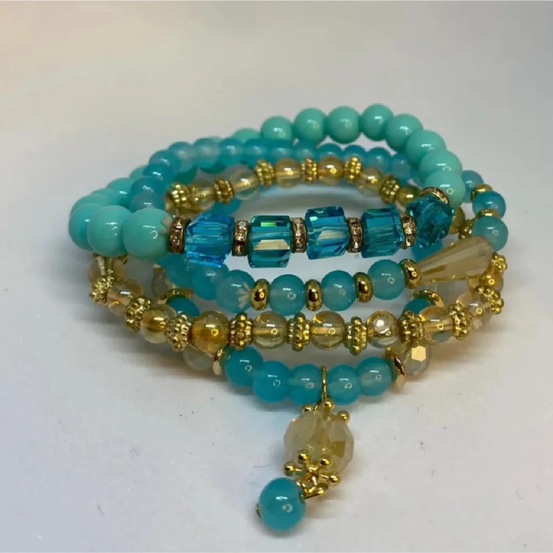 Flera armband i turkosa och guldiga pärlor med glittrande detaljer och små hängen. Armbanden har både runda och fyrkantiga pärlor i olika nyanser av blått och guld, vilket ger en cool och färgstark look. Ej använd utan kommer från min small business.
