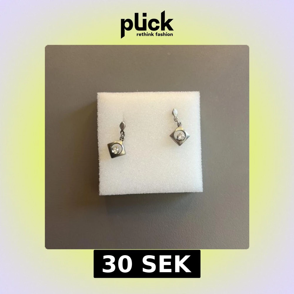 Säljer ett par stilrena silvriga örhängen med fyrkantig form och en diamant i mitten.