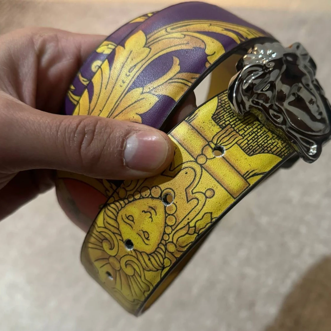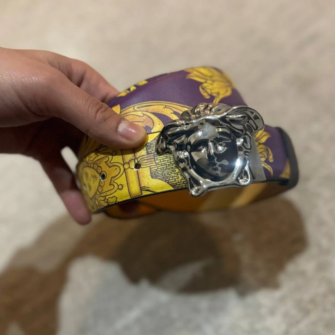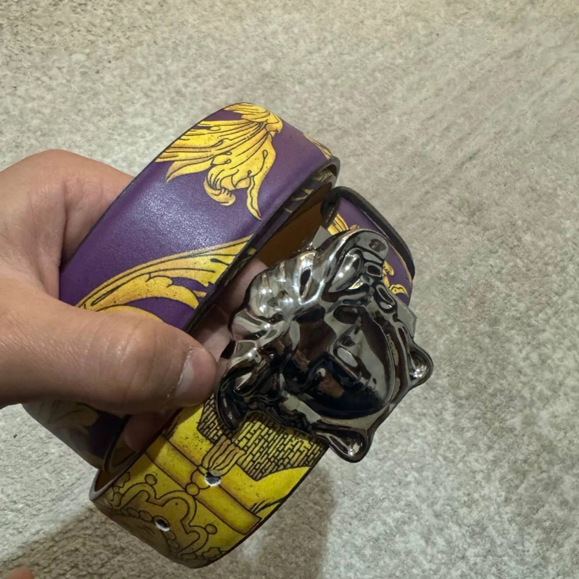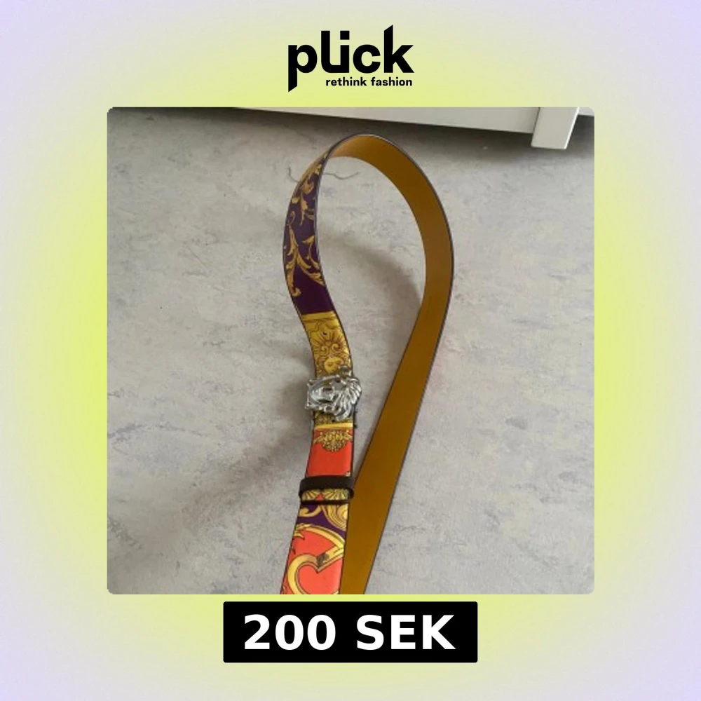 Snyggt bälte med ett färgglatt mönster i lila, gult och rött. Bältet har en iögonfallande silverspänne med ett unikt designmotiv. Perfekt för att ge din outfit en färgklick och stil.
