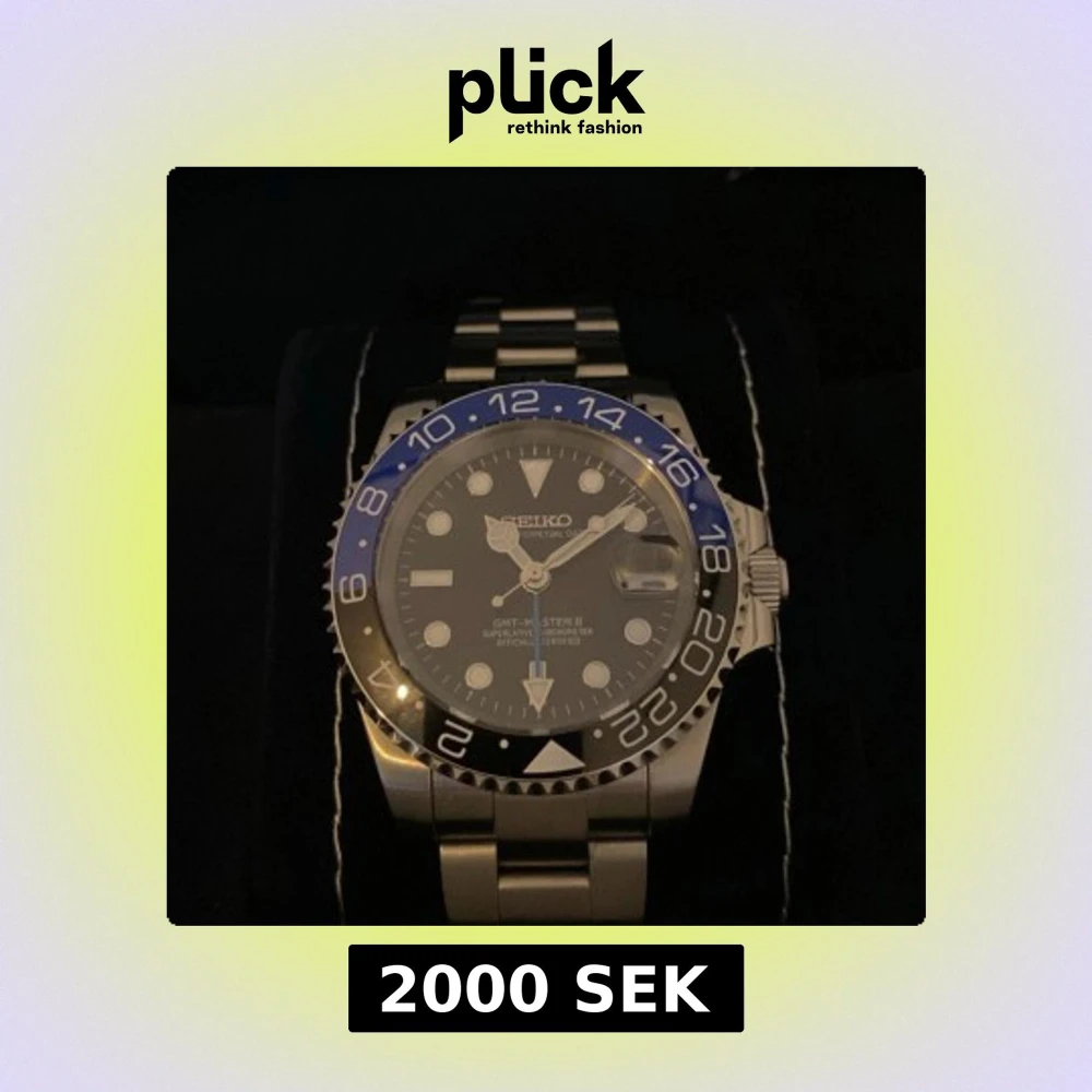 Säljer en Seiko klocka med en stilren design. Den har en blå och svart bezel med GMT-funktion och en robust länkarmband i silverfärgat stål. Perfekt för den som gillar en klassisk och funktionell stil.