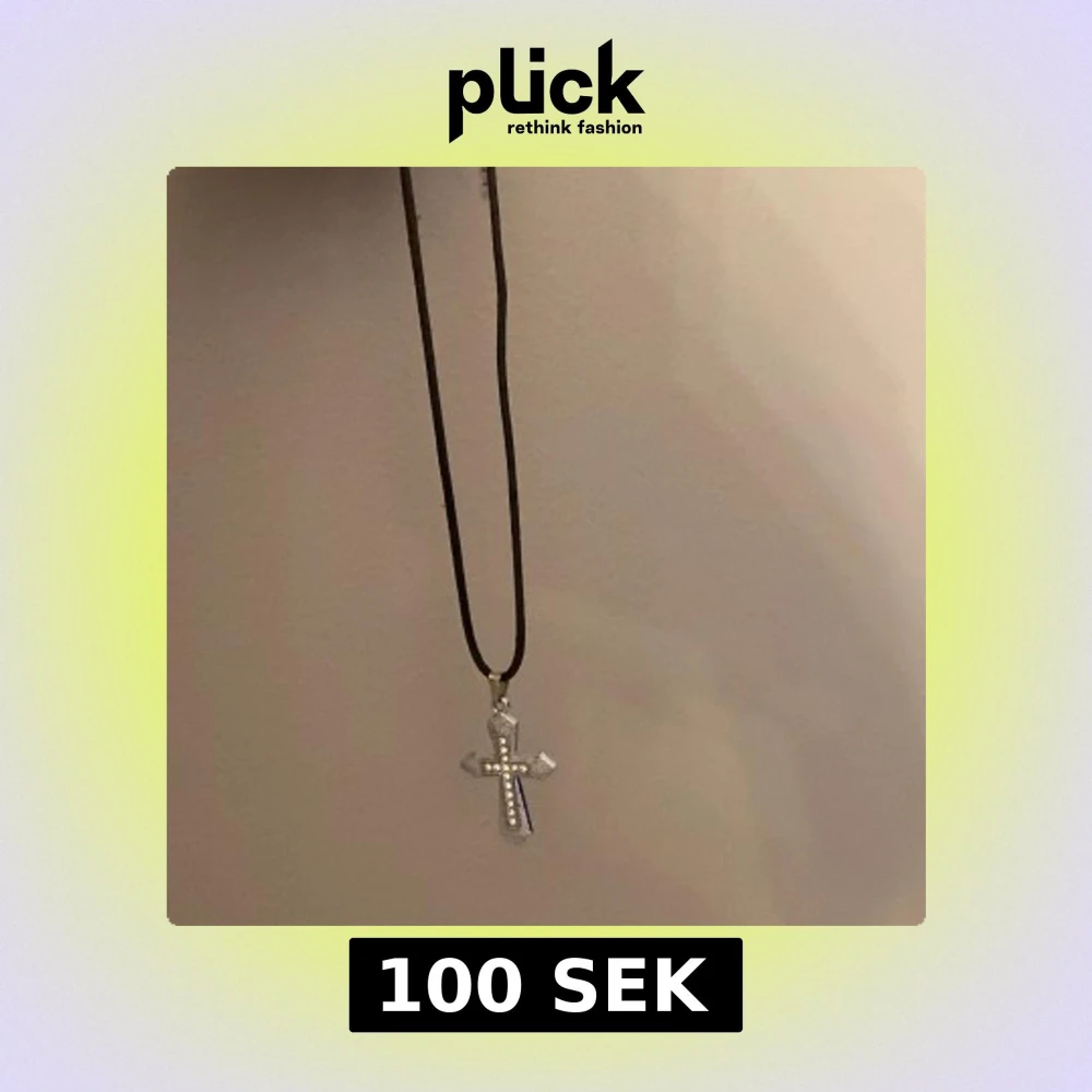 Snyggt halsband med ett korshänge i silverfärg. Hänget är dekorerat med små glittrande stenar och hänger på en svart rem. Perfekt för att ge en stilren touch till din outfit.