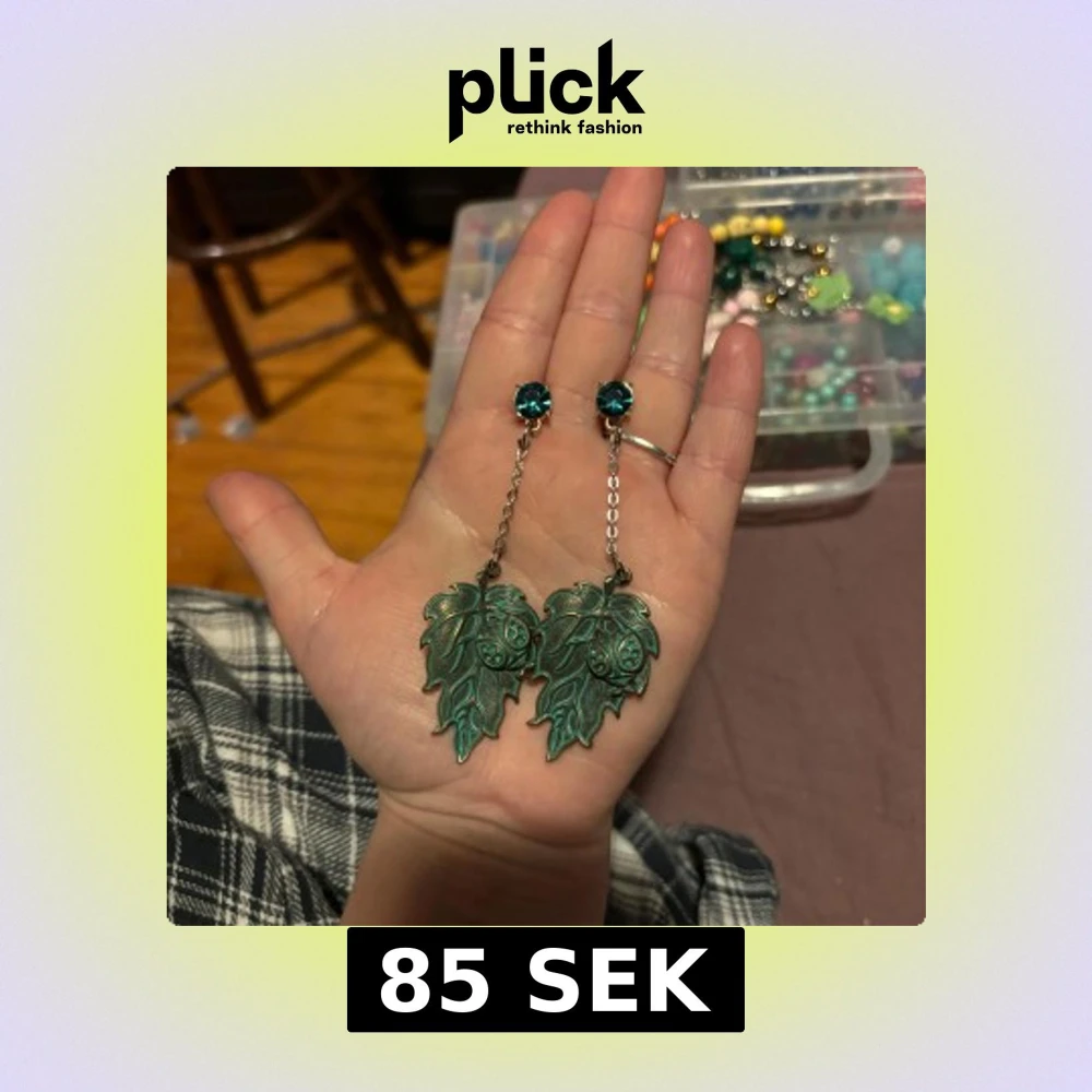Unika örhängen med gröna löv i metall och blå glittrande stenar upptill. Hängande modell med tunn silverfärgad kedja som ger en cool och bohemisk vibe. Perfekta för dig som vill sticka ut med naturinspirerade accessoarer.