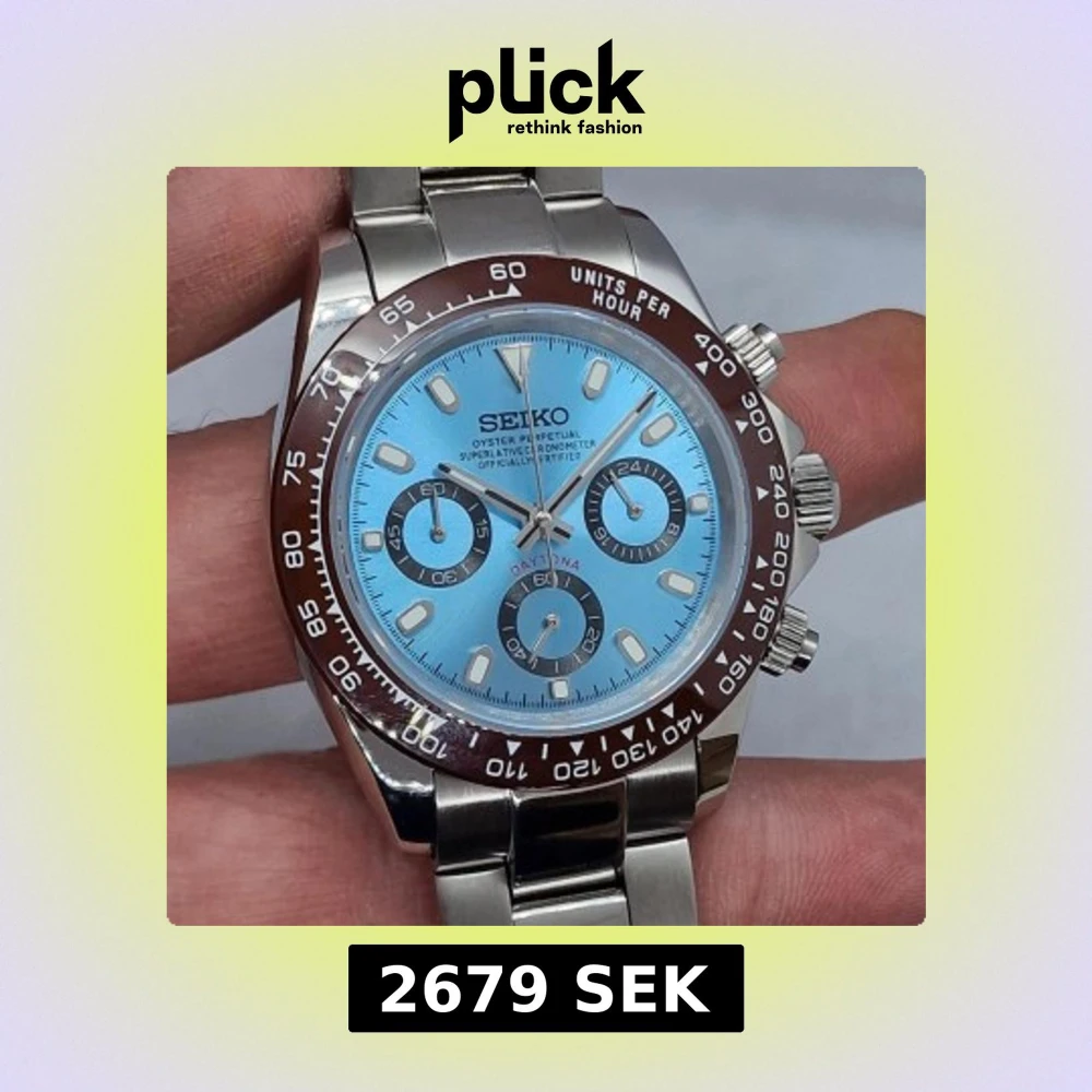 Snygg Seiko Daytona kronograf med en ljusblå urtavla och bruna detaljer runt boetten. Klockan har tre subdials, silverfärgade visare och index samt en robust länk i silverfärgat stål. Perfekt för dig som gillar sportig och stilren design.