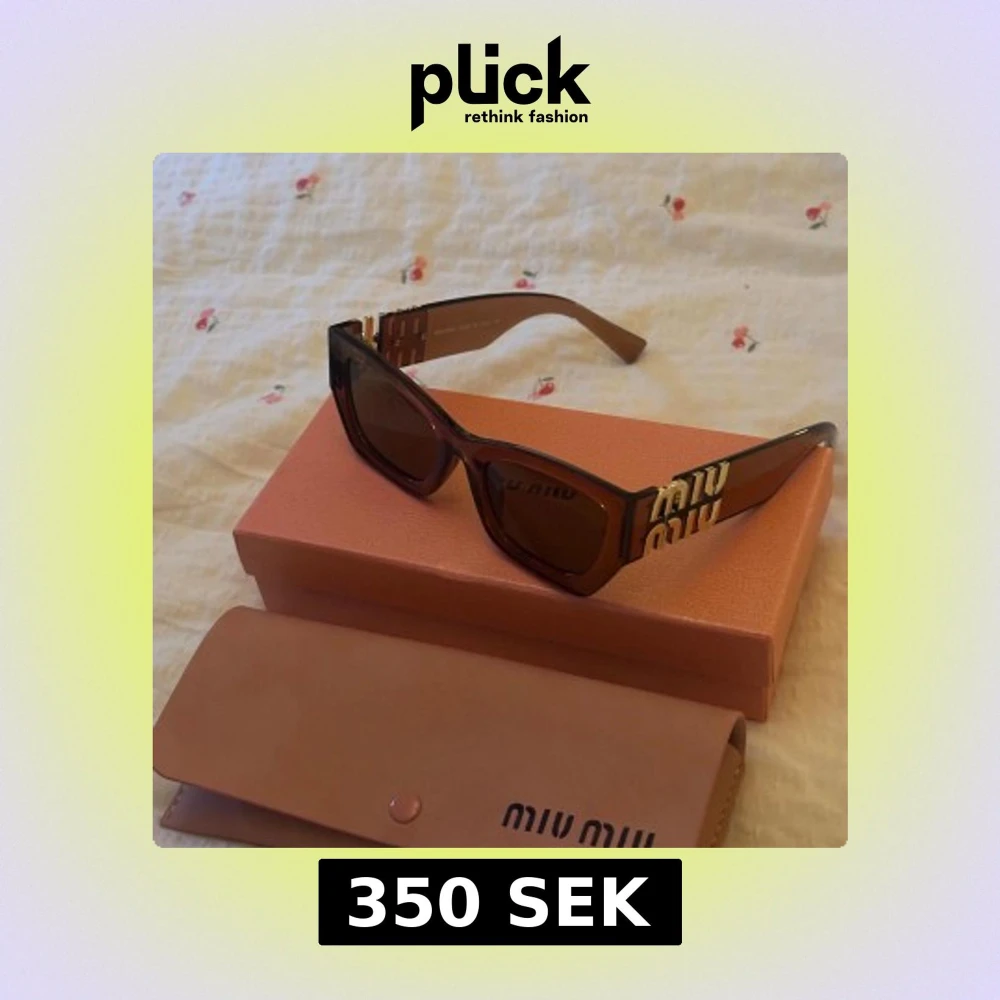 Snygga bruna solglasögon från Miu Miu med rektangulär form och breda skalmar. På sidan sitter en stor guldlogga som ger en lyxig vibe. Helt nya och oanvända. OBS! Utan originalfodral och ask. Inget kvitto, ni vet varför det är billigt 🌸