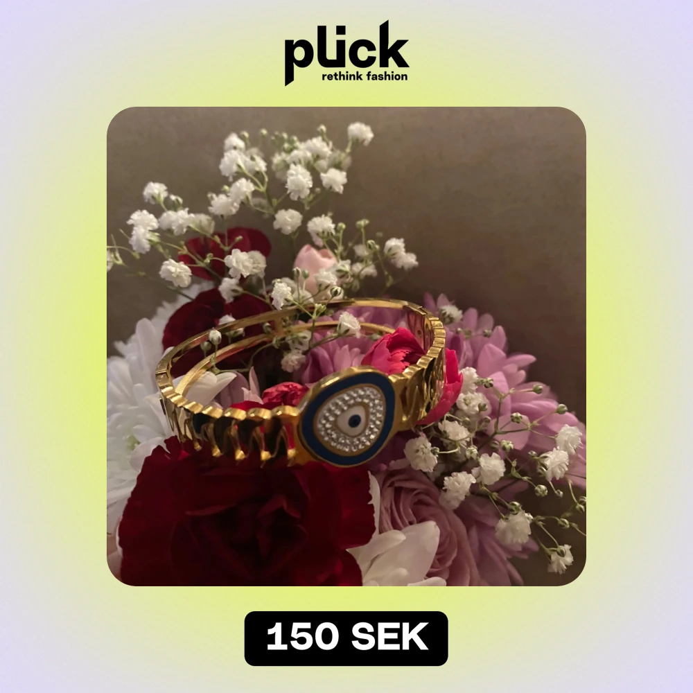 Snyggt guld färger armband i rostfritt stål med en unik öga-design i mitten. Armbandet har en blå och vit detalj runt ögat som ger en cool kontrast. Perfekt för att ge din outfit en extra touch av stil. Passar både till vardags och festliga tillfällen!