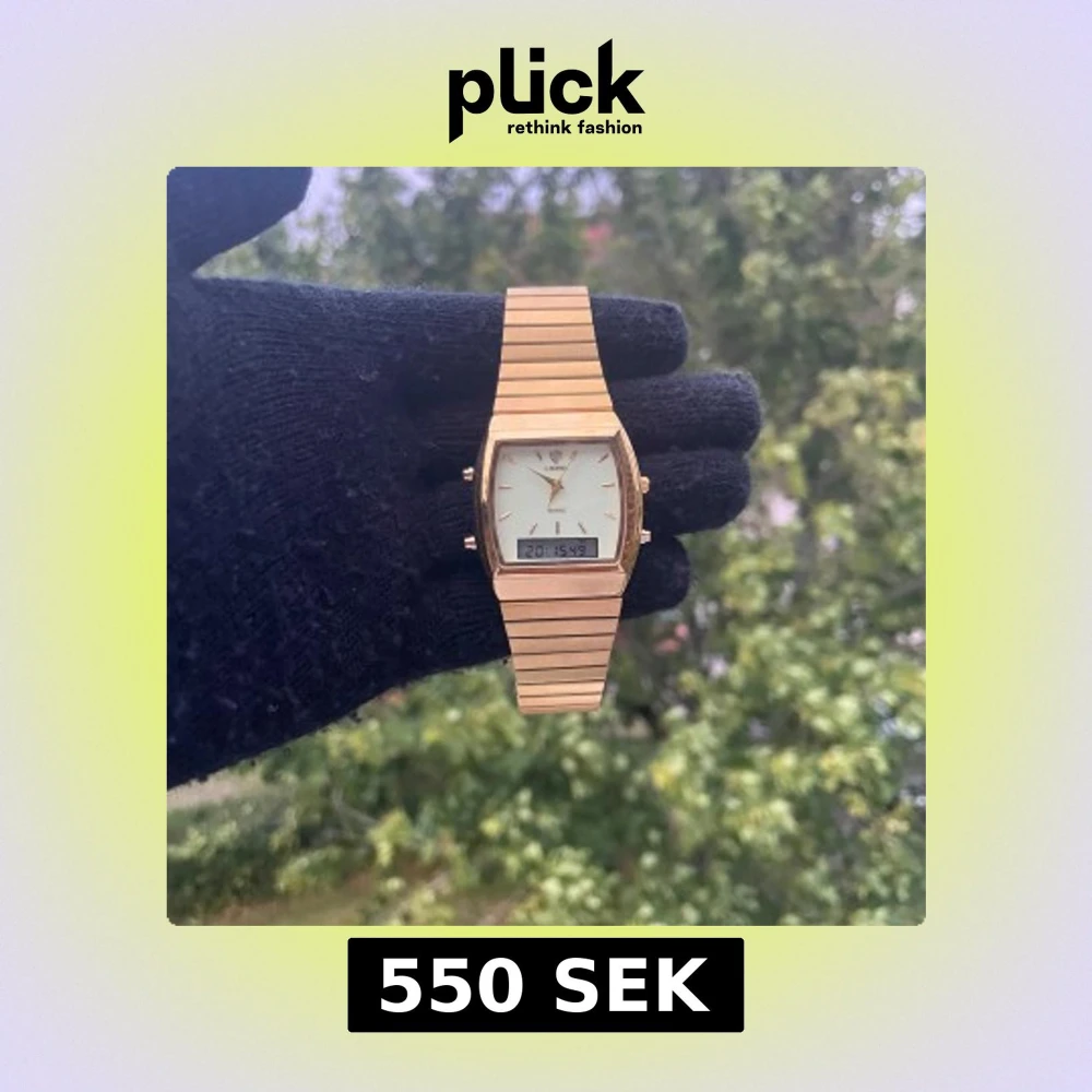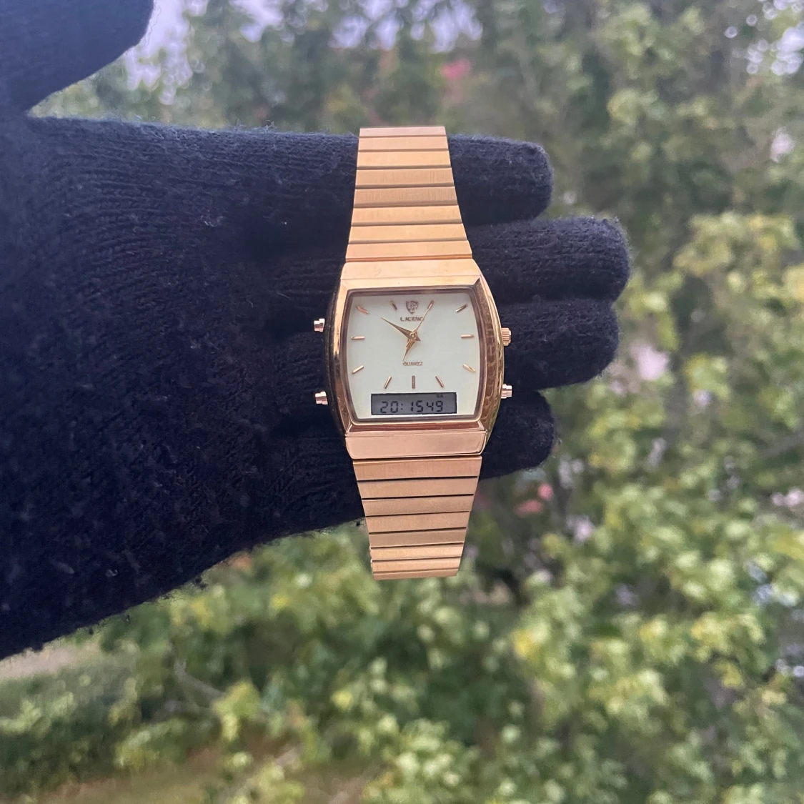 Snygg guldig klocka från Lorus med både digital och analog visning. Klockan har en rektangulär urtavla med guldfärgade detaljer och länkarmband i metall. Perfekt för dig som gillar retrostil och vill ha både klassisk och modern känsla.