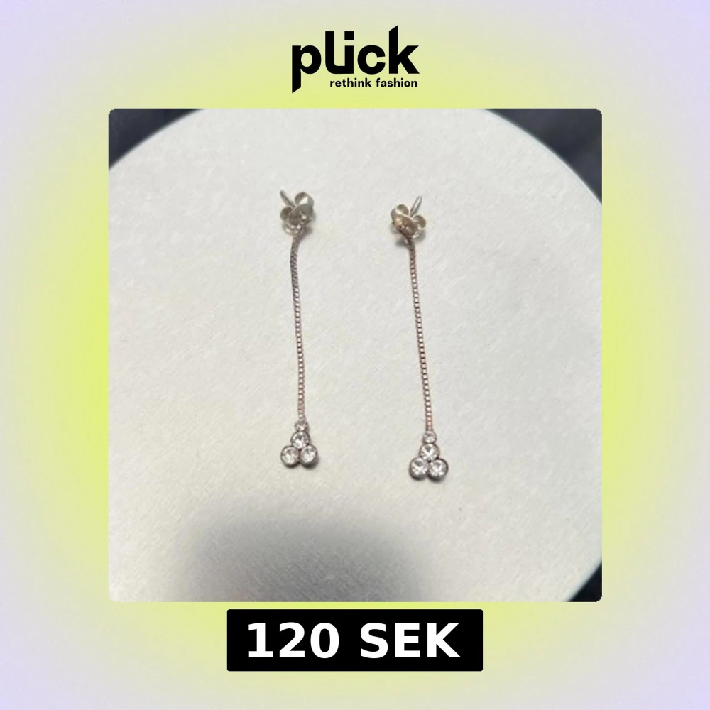 Säljer ett par eleganta, långa örhängen i silverfärg med tunn kedja och tre gnistrande stenar längst ner. Perfekta för att ge en stilren och glittrig touch till din look.