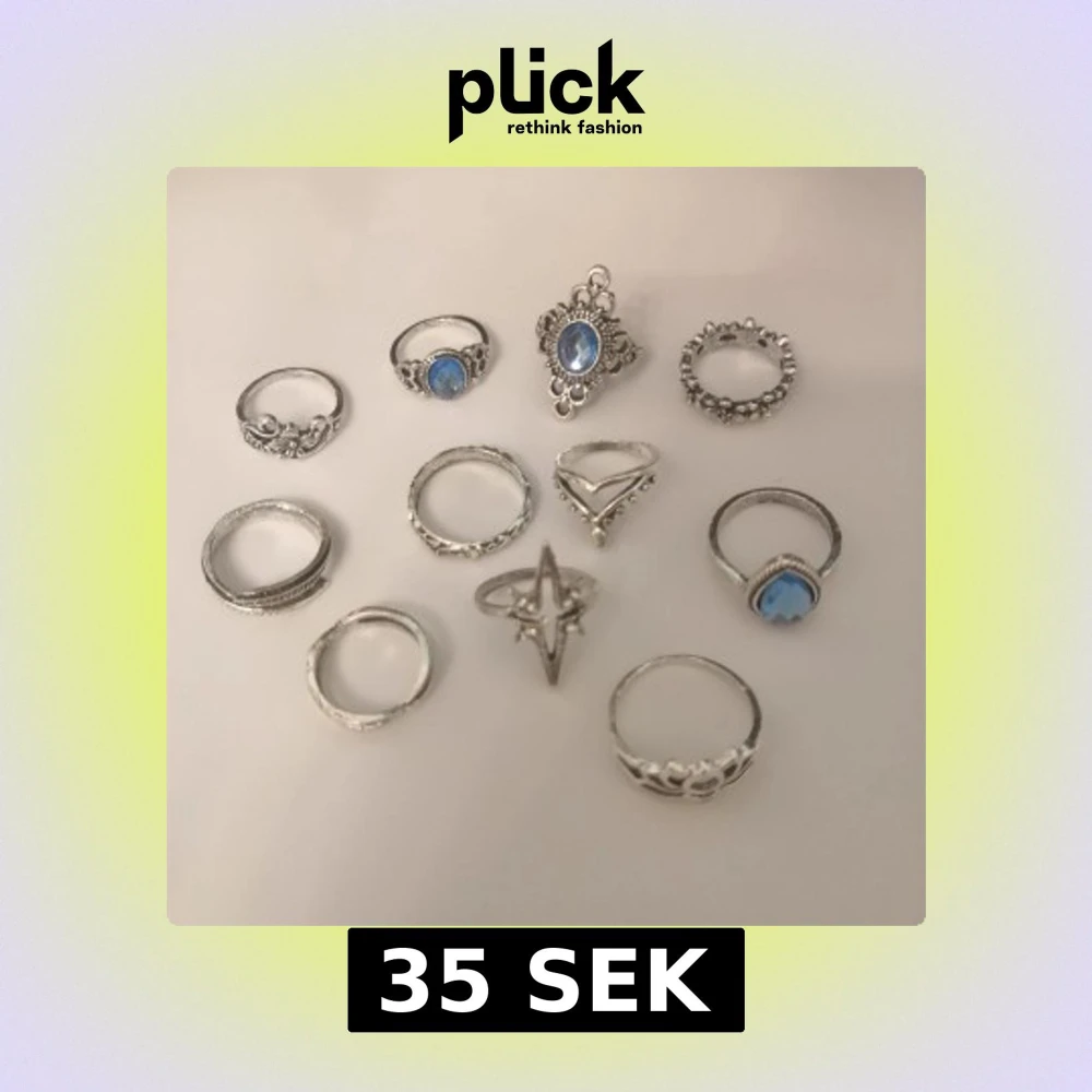11 st ringar med olika former och mönster. Storlek är 14mm-18mm. Färg är silver. Material är zinc alloy