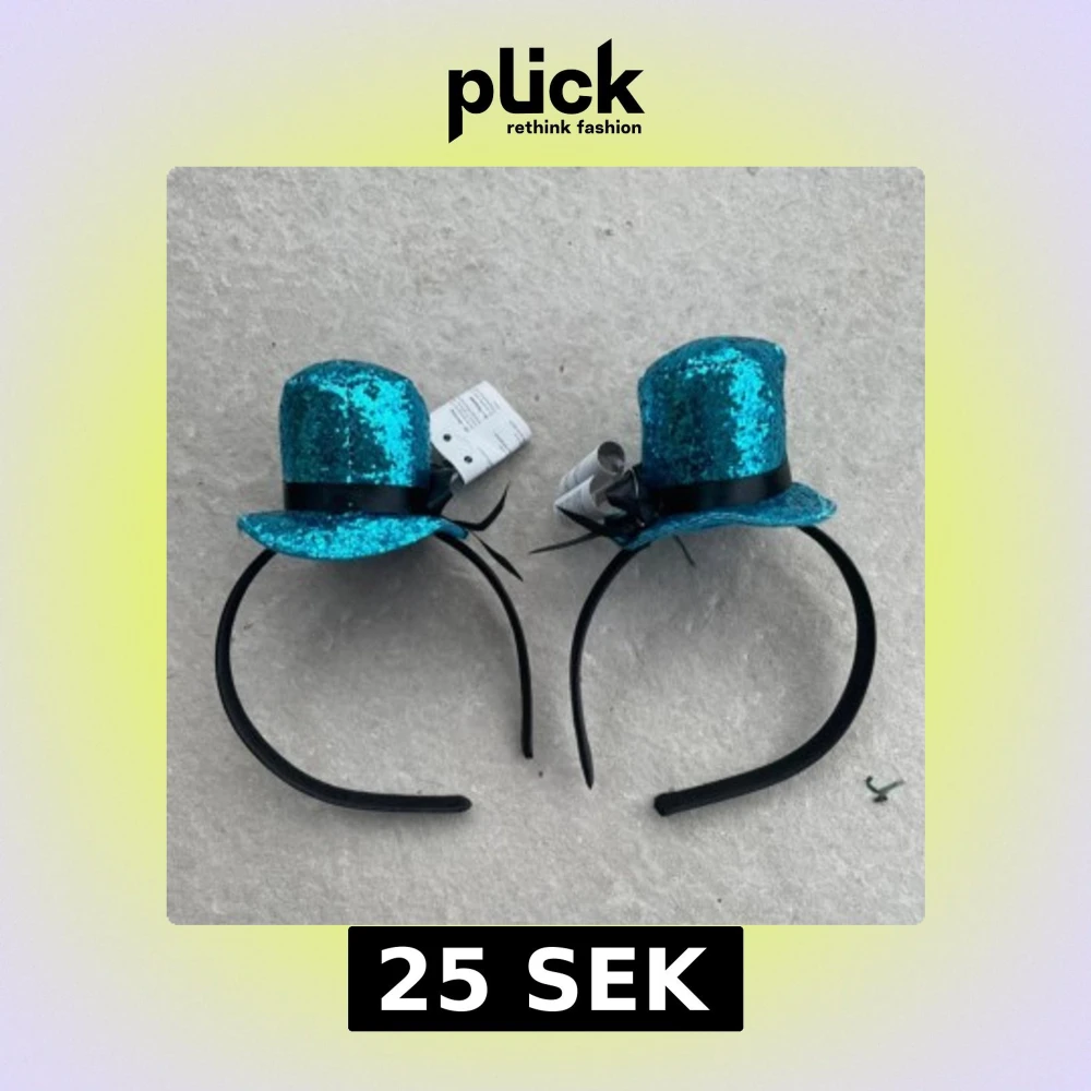 Två diadem med minihatt i blått glitter och svart band. Hatten är cylinderformad och sitter fast på ett svart diadem. Perfekt för att sticka ut på festen eller temadagen.