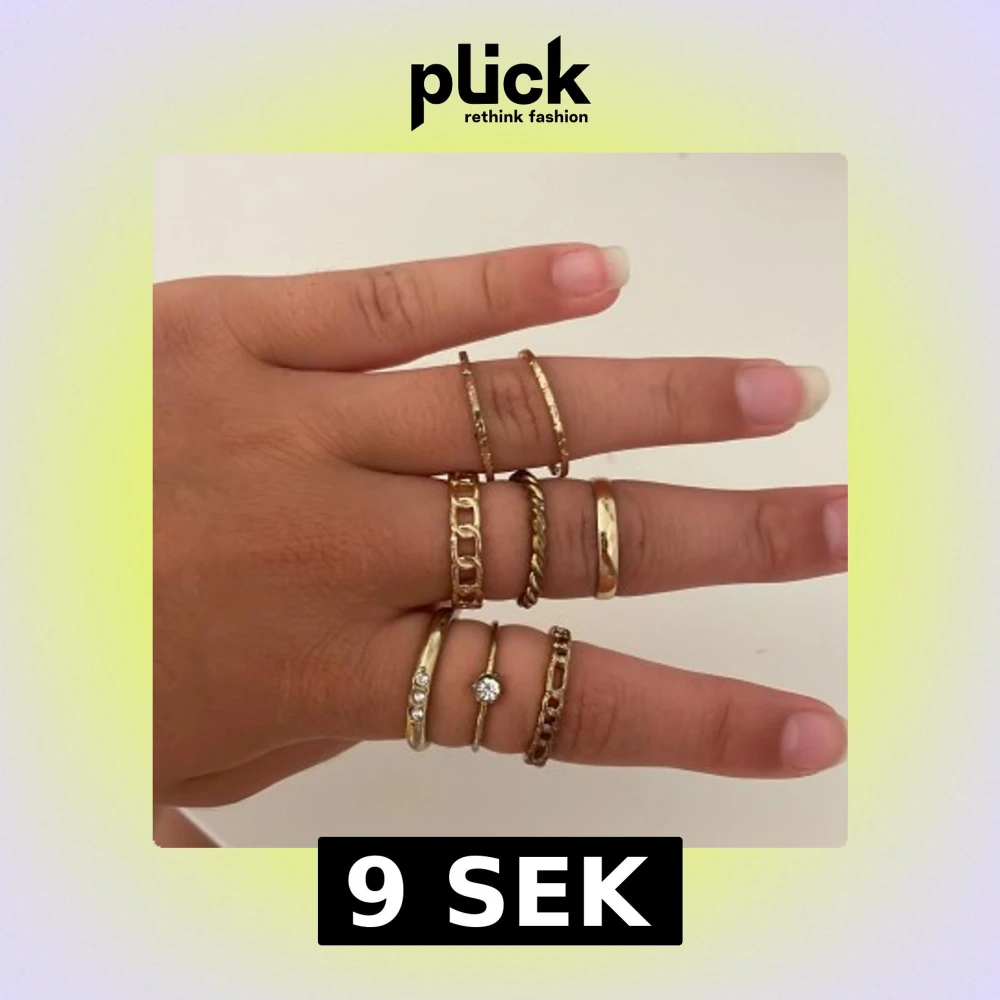 Säljer ett set med åtta trendiga guldiga ringar i olika former och stilar. Några har kedjelänk-design, en är tvinnad och en har en liten glittrande sten. Perfekt för att mixa och matcha på flera fingrar för en cool look.
