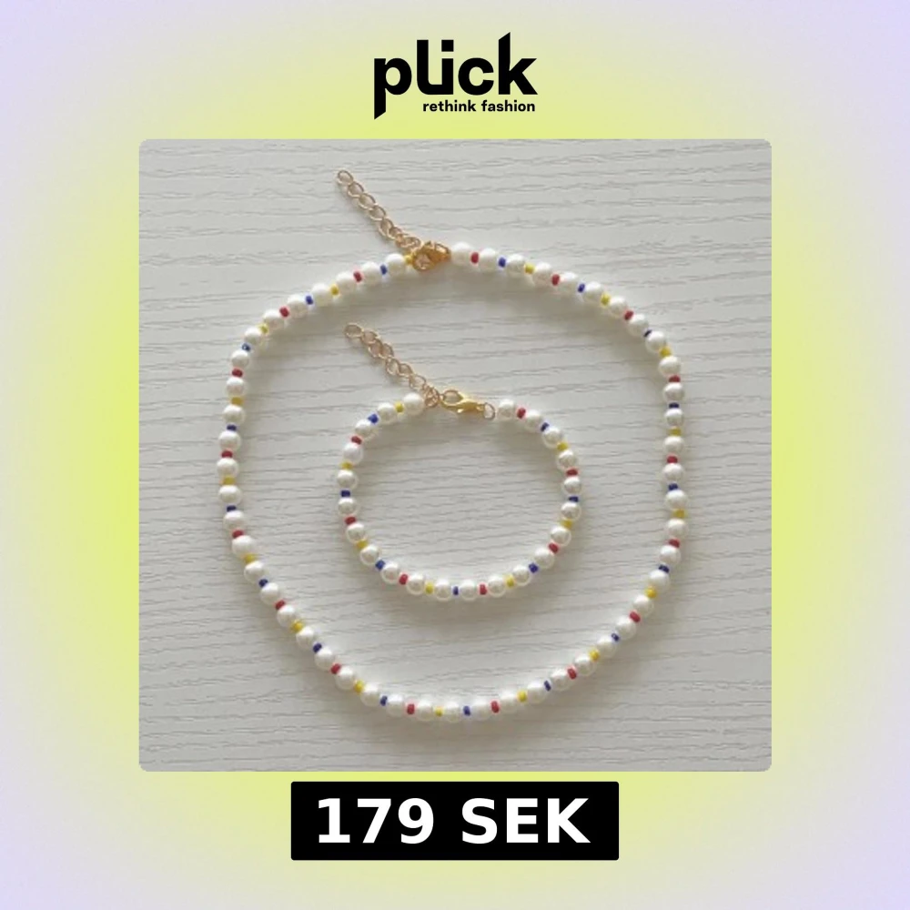 Säljer ett pärlset med halsband och armband. Båda har vita pärlor med små inslag av röda, blå och gula pärlor. Kedjor och lås är i guldton. Perfekt för dig som gillar färgglada accessoarer med en lekfull touch.