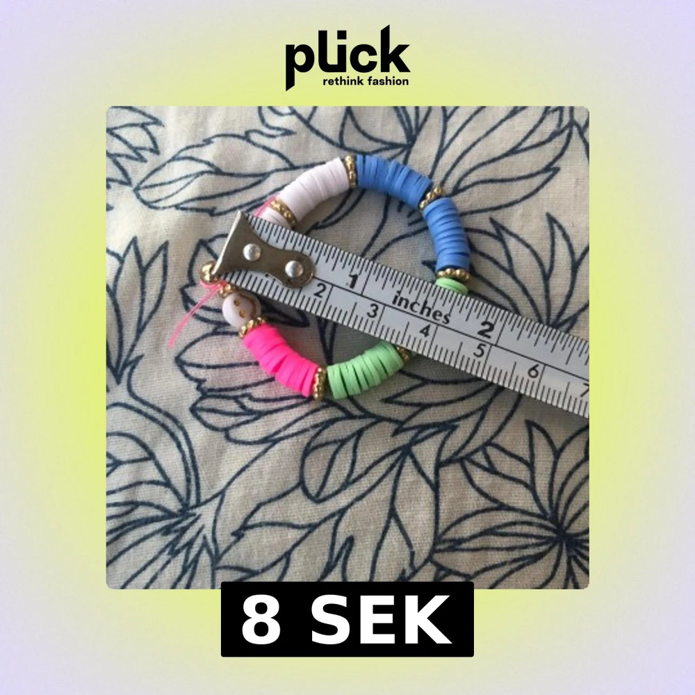 Säljer ett coolt armband med platta pärlor i blått, vitt, rosa och grönt, dekorerat med små guldfärgade pärlor och en vit smiley-pärla. Perfekt accessoar för dig som gillar färg och lekfull stil. Stretchig och bekväm att bära.