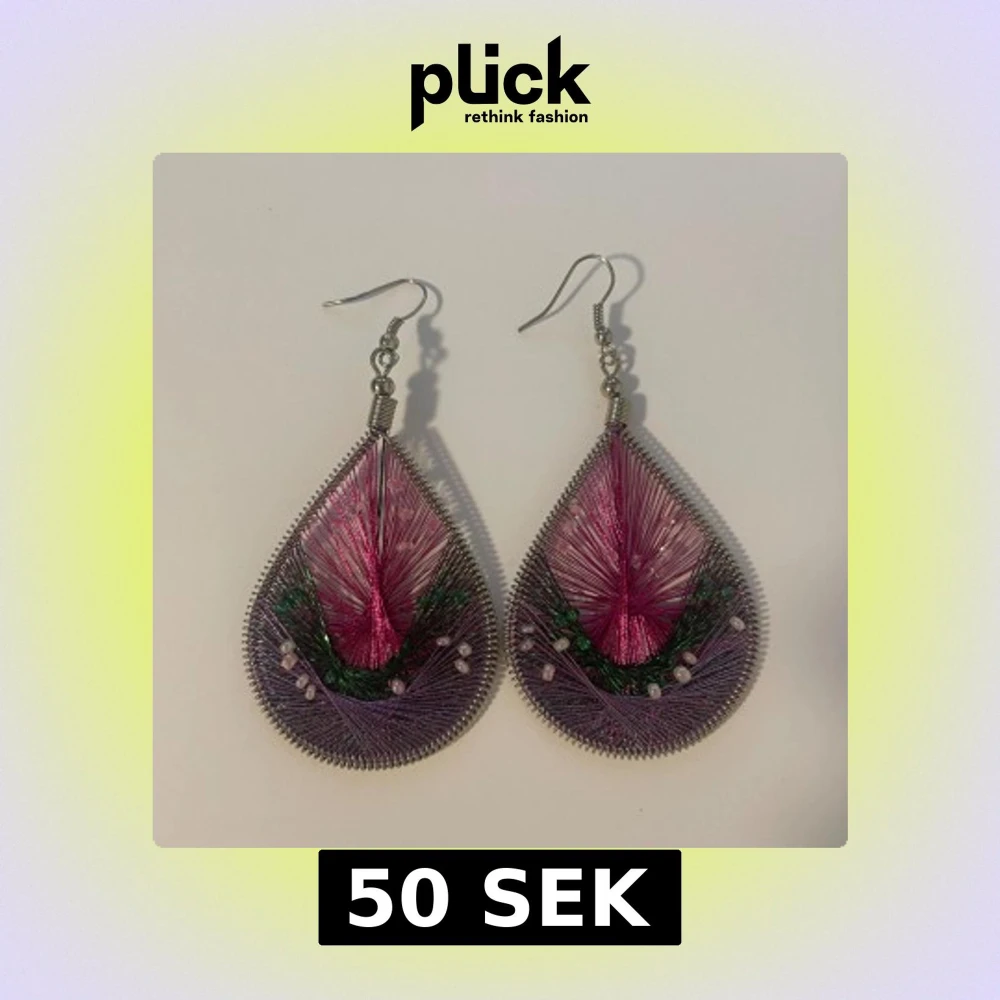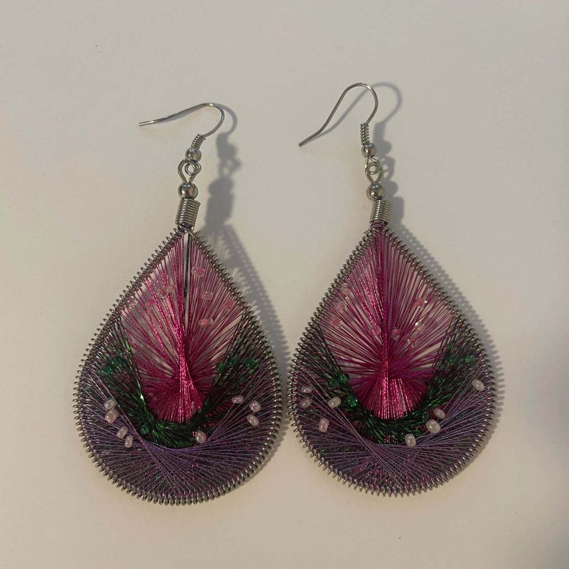 Unika droppformade örhängen med trådar i lila, rosa och grönt, dekorerade med små pärlor. Metallramen ger en cool kontrast till de färgglada trådarna. Ca 7 cm långa, perfekta för att sticka ut och ge din look en kreativ vibe. Handgjorda, ej av mig.