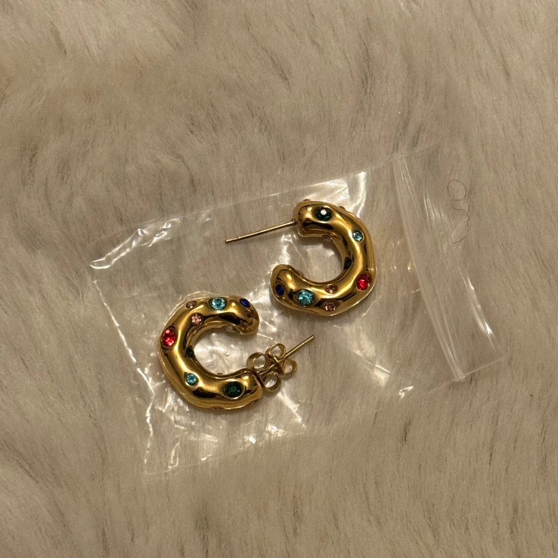 Säljer ett par snygga guldörhängen med coola färgglada stenar. De har en unik, böjd form som verkligen sticker ut. Perfekta för att liva upp vilken outfit som helst!
