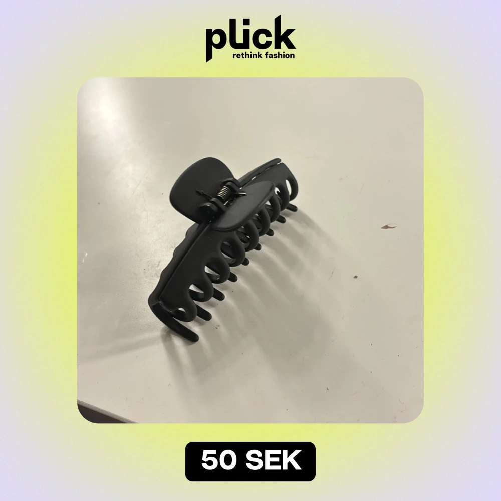 Jag säljer en svart hårklämma i plast med en enkel och stilren design. Perfekt för att hålla håret på plats i en snygg uppsättning. Klämman har en stark fjäder för bra grepp och passar både till vardags och fest.