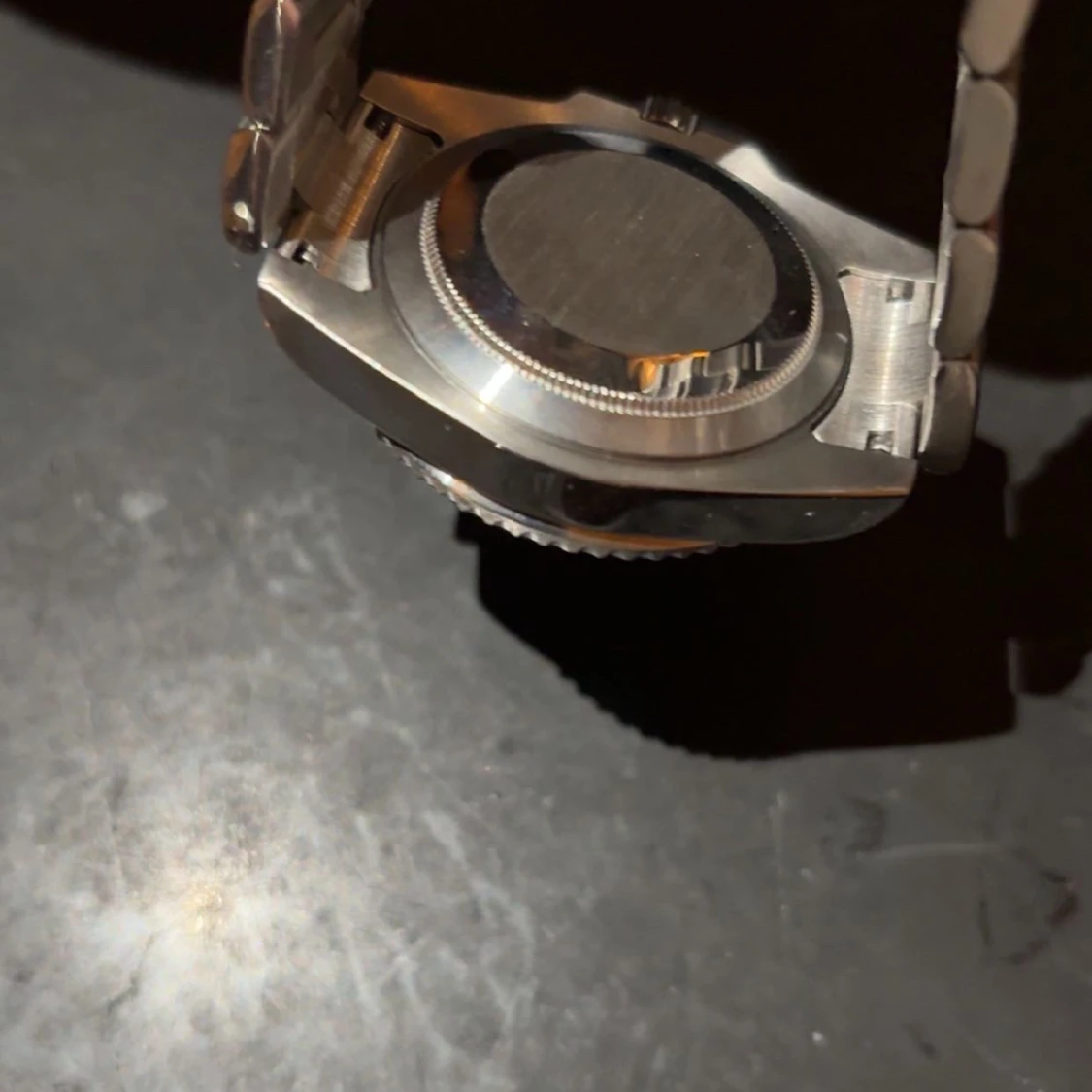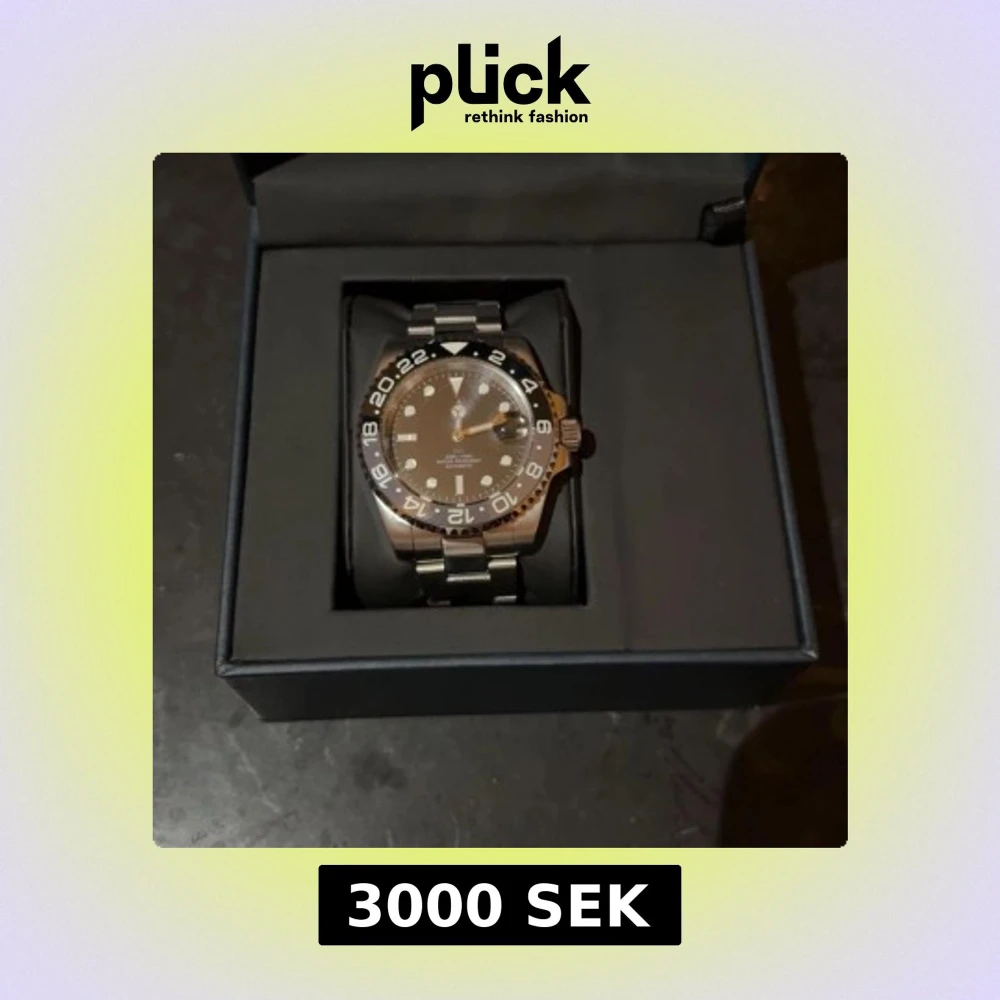 Snygg GMT-Master II med svart urtavla och svart/silver vridring. Klockan har en robust länk i silverfärgat stål och tydliga indexmarkeringar. Klockan kommer även med ett svart gummiband om man vill ha det
