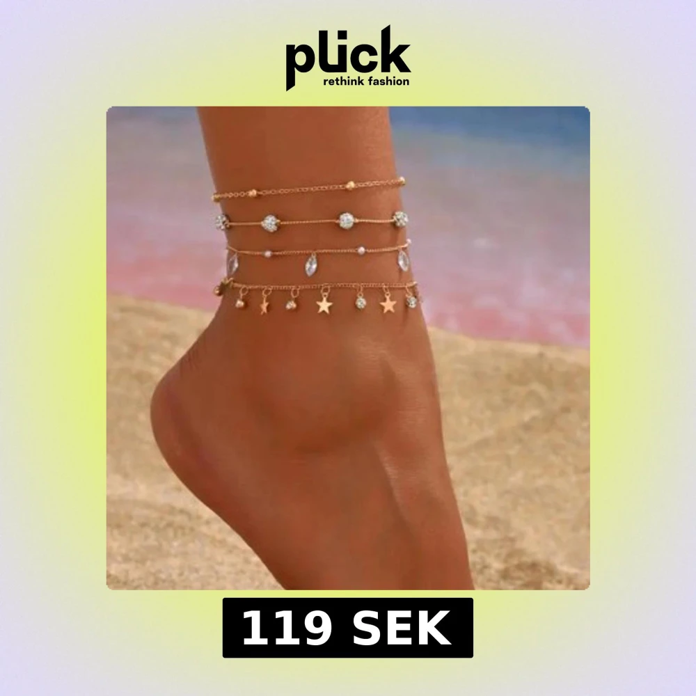 Säljer ett set med tunna guldiga fotlänkar med små stjärnhängen, pärlor och gnistrande stenar. Perfekt accessoar för stranden eller sommarens äventyr. Kedjorna är tunna och smyckade med detaljer som ger en trendig och lekfull look.