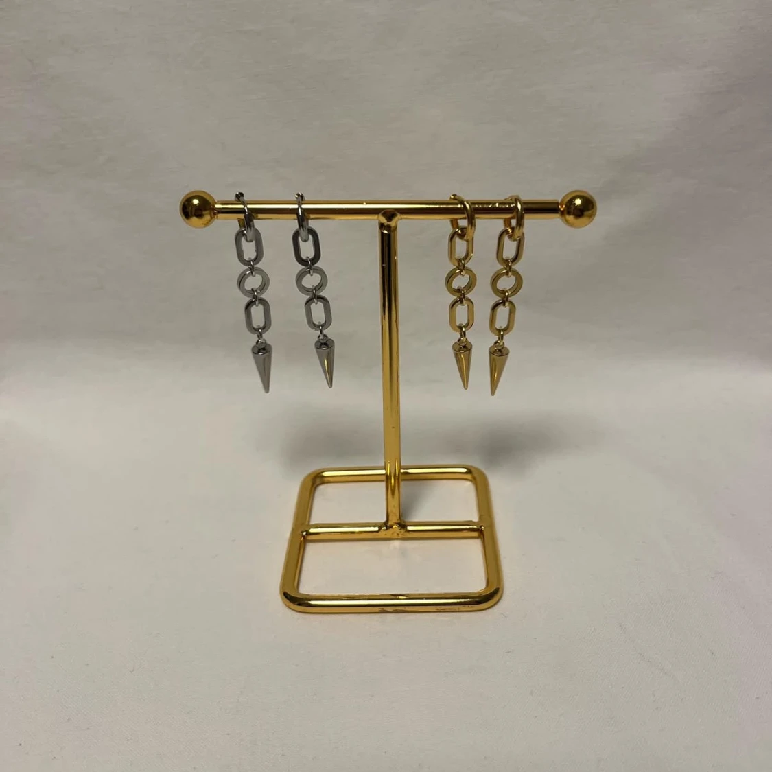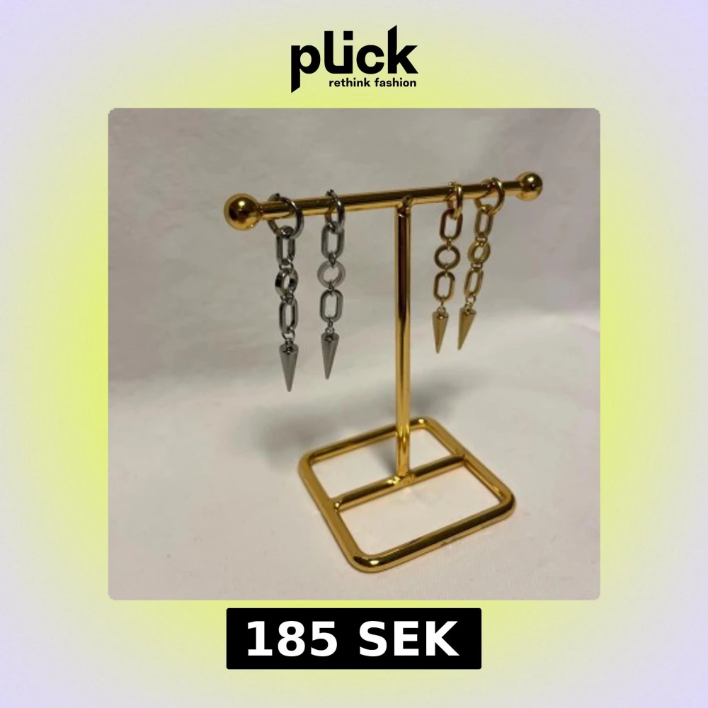 Två par coola örhängen med chunky kedjor och spetsiga spikes i metall. Ena paret är i silverfärg och det andra i guld, båda har en edgy vibe och passar perfekt till streetstyle. Säljs utan märke, materialet är metall och designen är riktigt trendig.