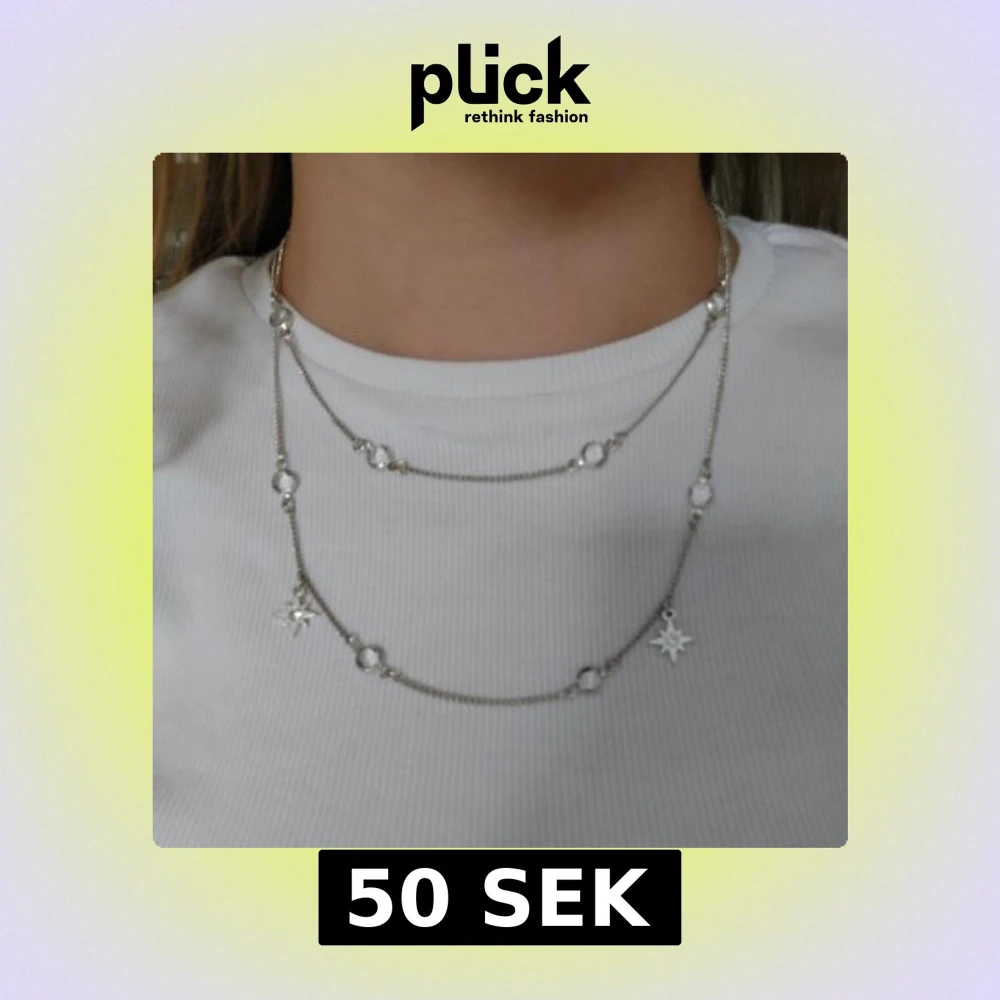 Silverfärgat halsband med dubbla kedjor och stjärndetaljer. Halsbandet har små, runda länkar och stjärnberlocker med glittrande stenar i mitten.💫