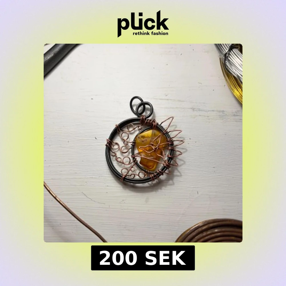 Säljer ett handgjort halsbands-hänge med en vacker bärnsten infattad i en cirkel av svart metall och koppartråd. Designen har ett intrikat mönster som ska likna en sol 🌅 och en måne 🌙