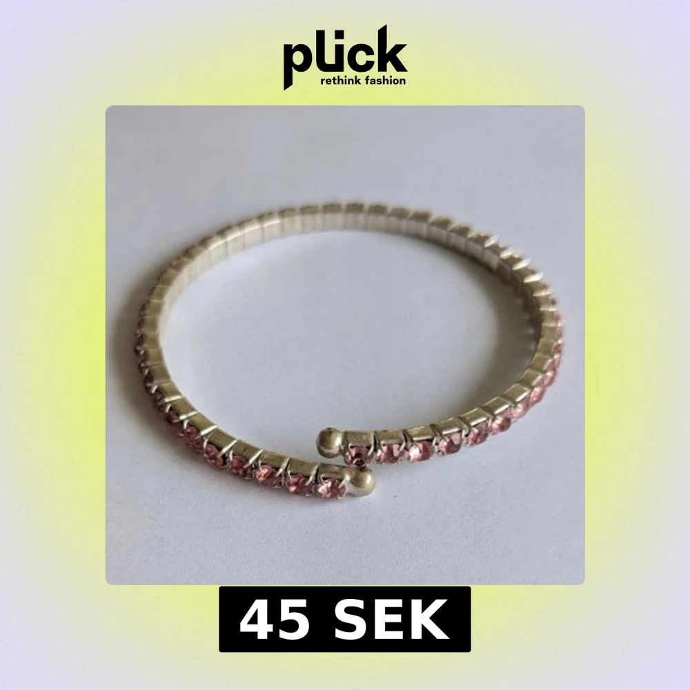 Elegant armband i silverfärg med gnistrande rosa stenar. Perfekt för att ge en touch av glamour till din outfit. Armbandet har en flexibel design som gör det enkelt att ta på och av.