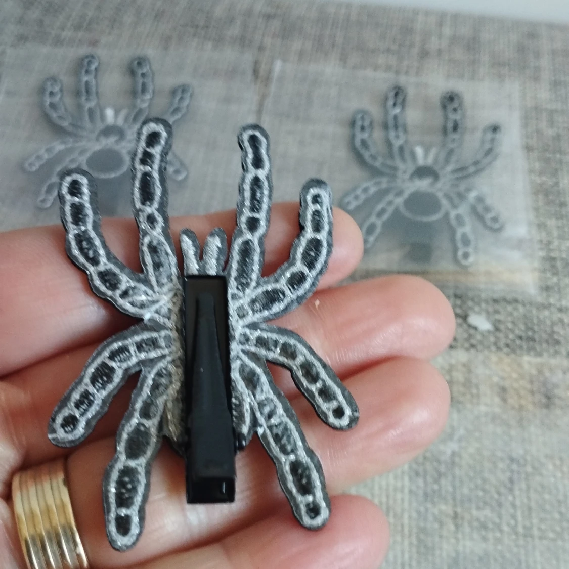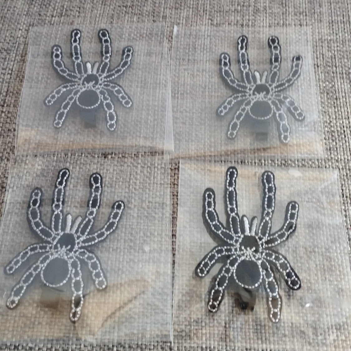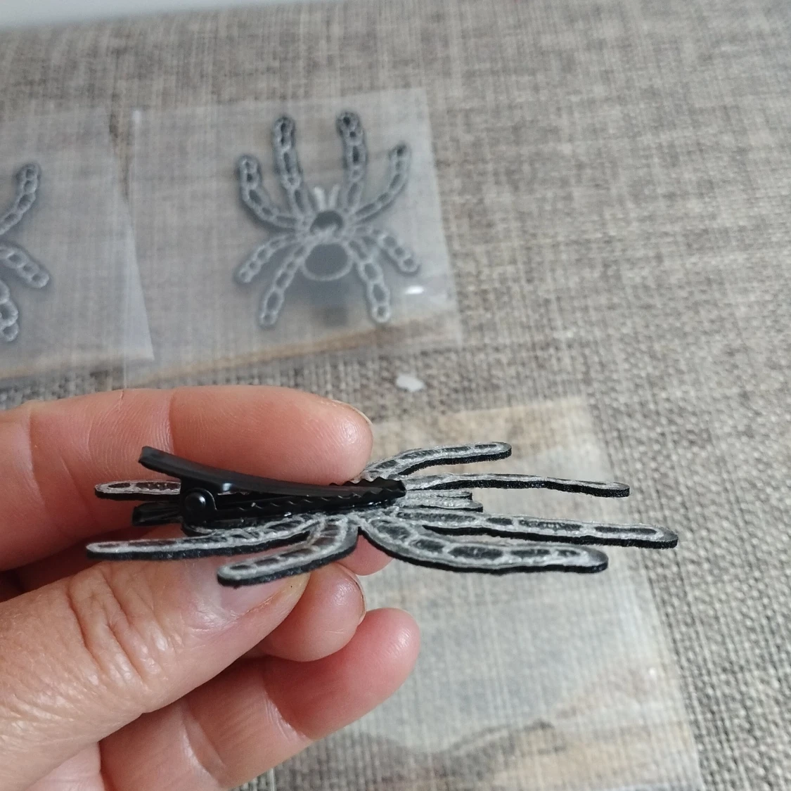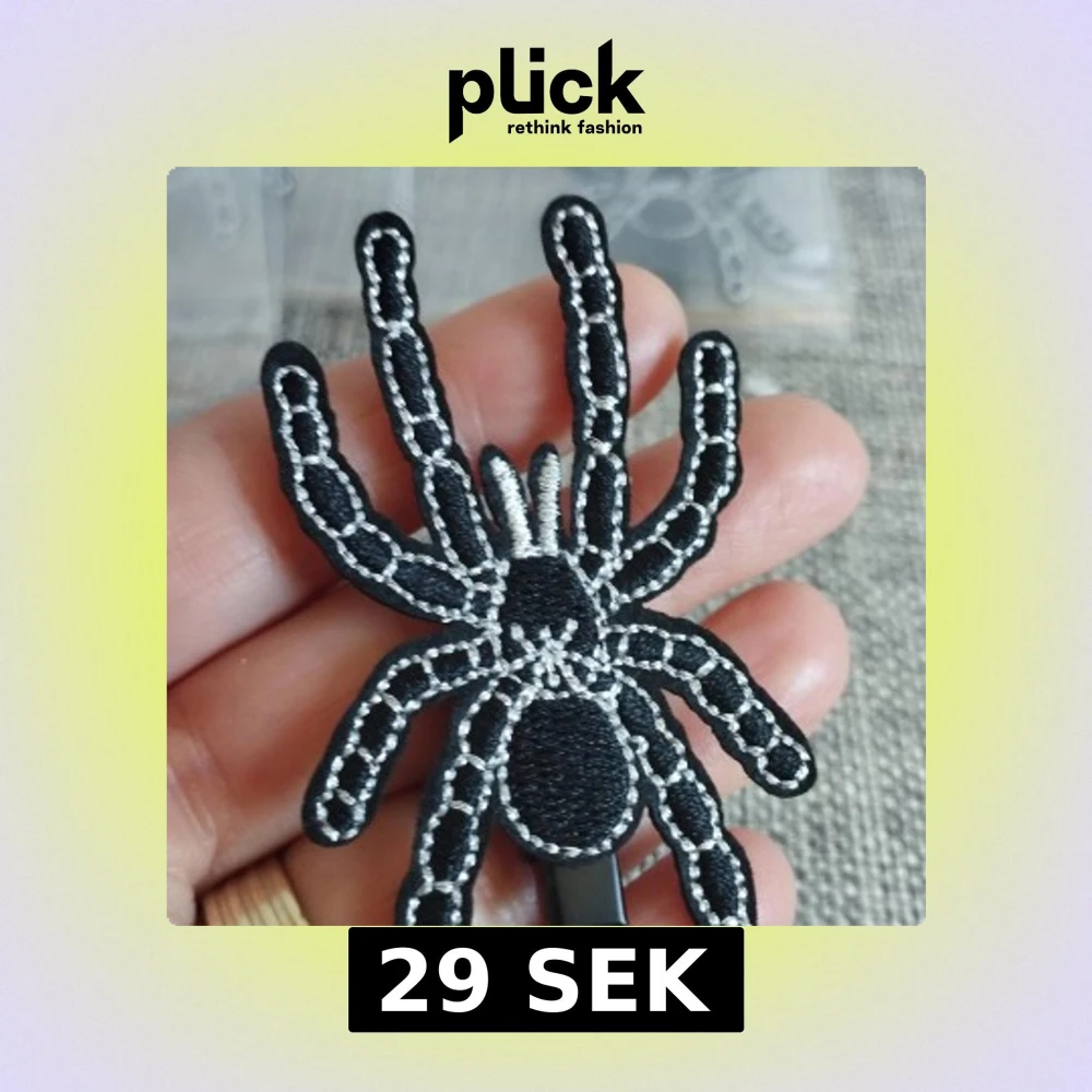 Unik hårklämma i form av en spindel med svarta och vita detaljer. Perfekt för att ge en edgy touch till din frisyr. Klämman är lätt att använda och håller håret på plats.