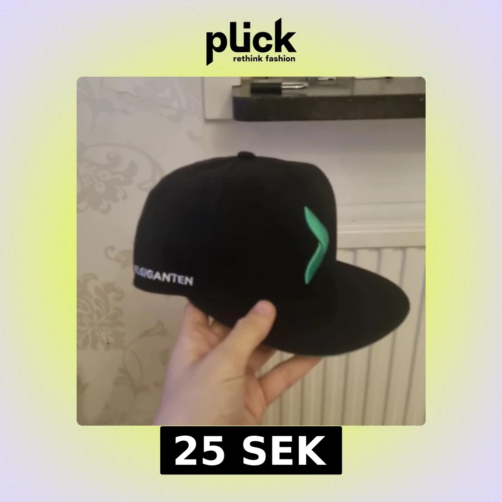 Snygg svart keps med en grön broderad logga på framsidan och texten 'Elgiganten' på sidan. Kepsen har en platt skärm med grön undersida och justerbar passform. Exklusive keps från elgiganten