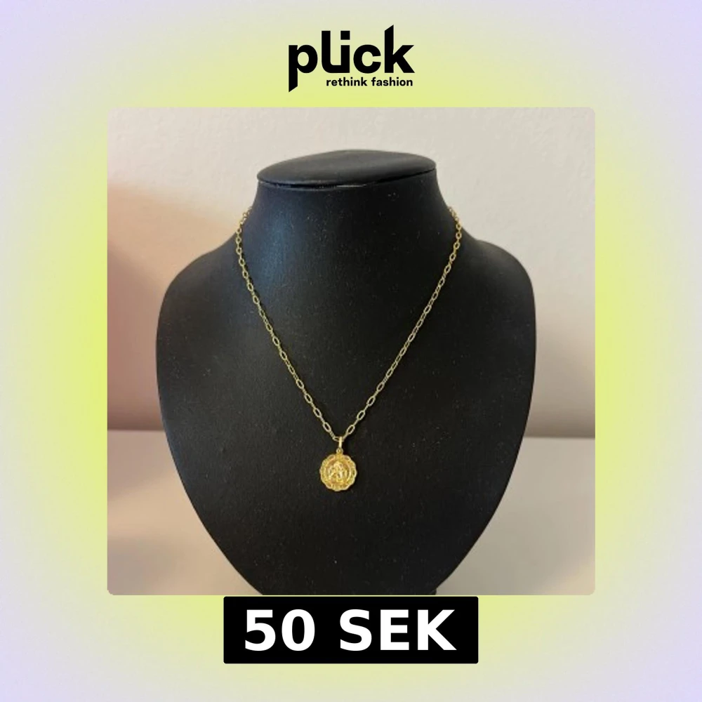 Snyggt halsband i guld med en rund medaljong som hänge. Kedjan är tunn och elegant, perfekt för att lyfta vilken outfit som helst. Medaljongen har ett detaljerat mönster som ger en unik touch.