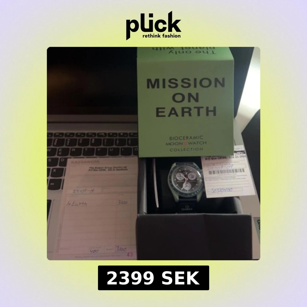 Säljer en Omega x Swatch MoonSwatch från Bioceramic MoonSwatch Collection, Mission on Earth. Klockan har en grön boett, svart urtavla med vita detaljer och kronograffunktion. Kommer i originalförpackning med kvitto. Perfekt för dig som gillar unika accessoarer.