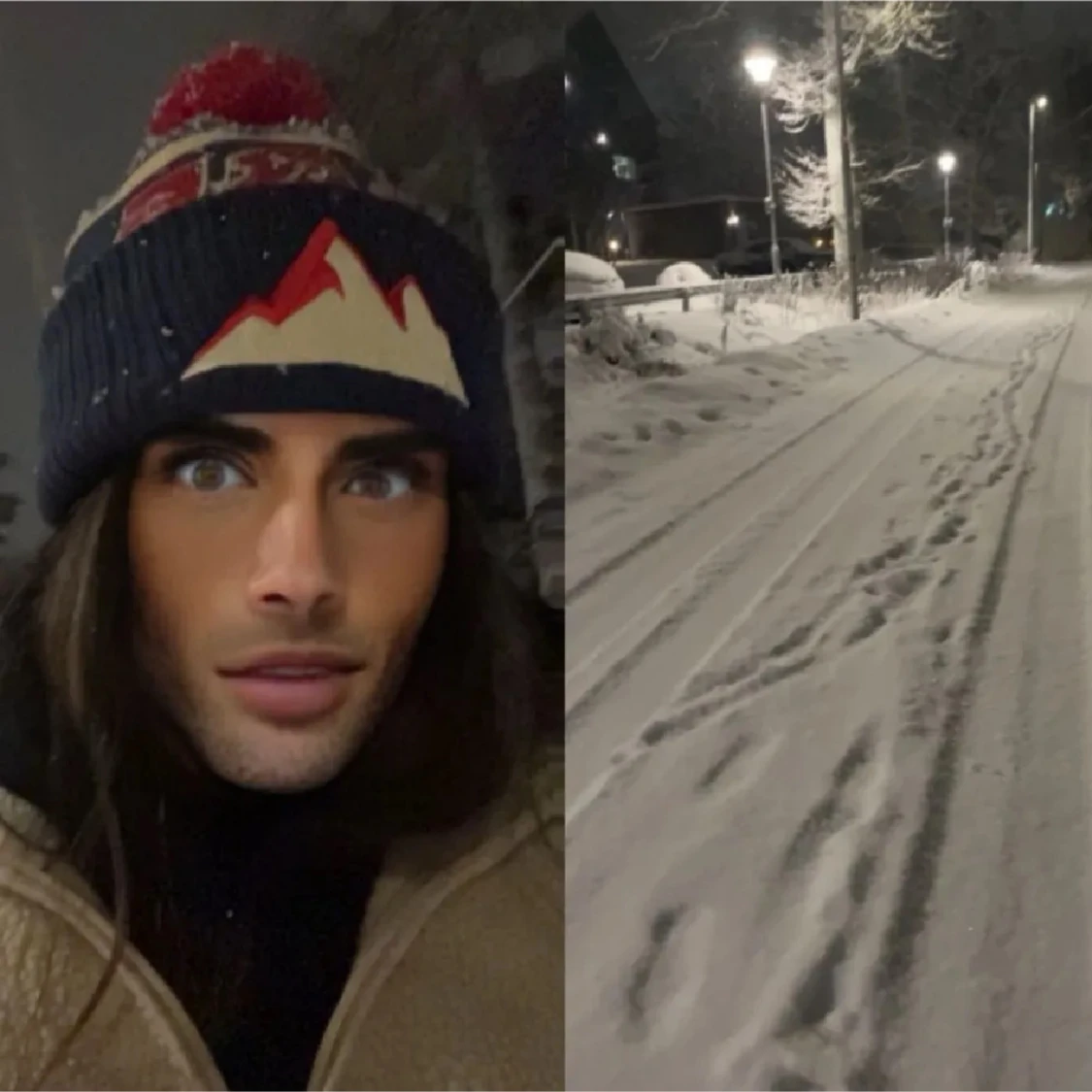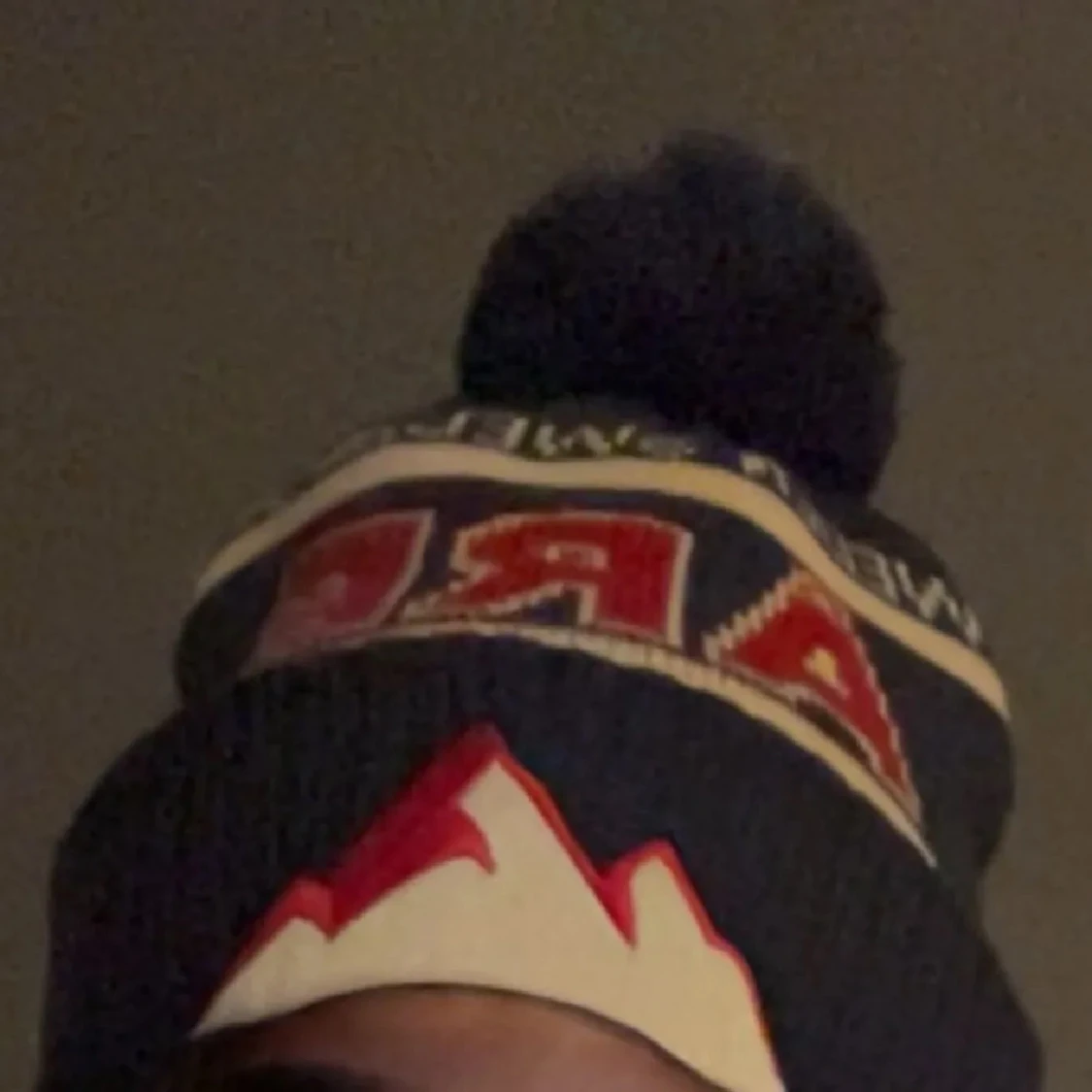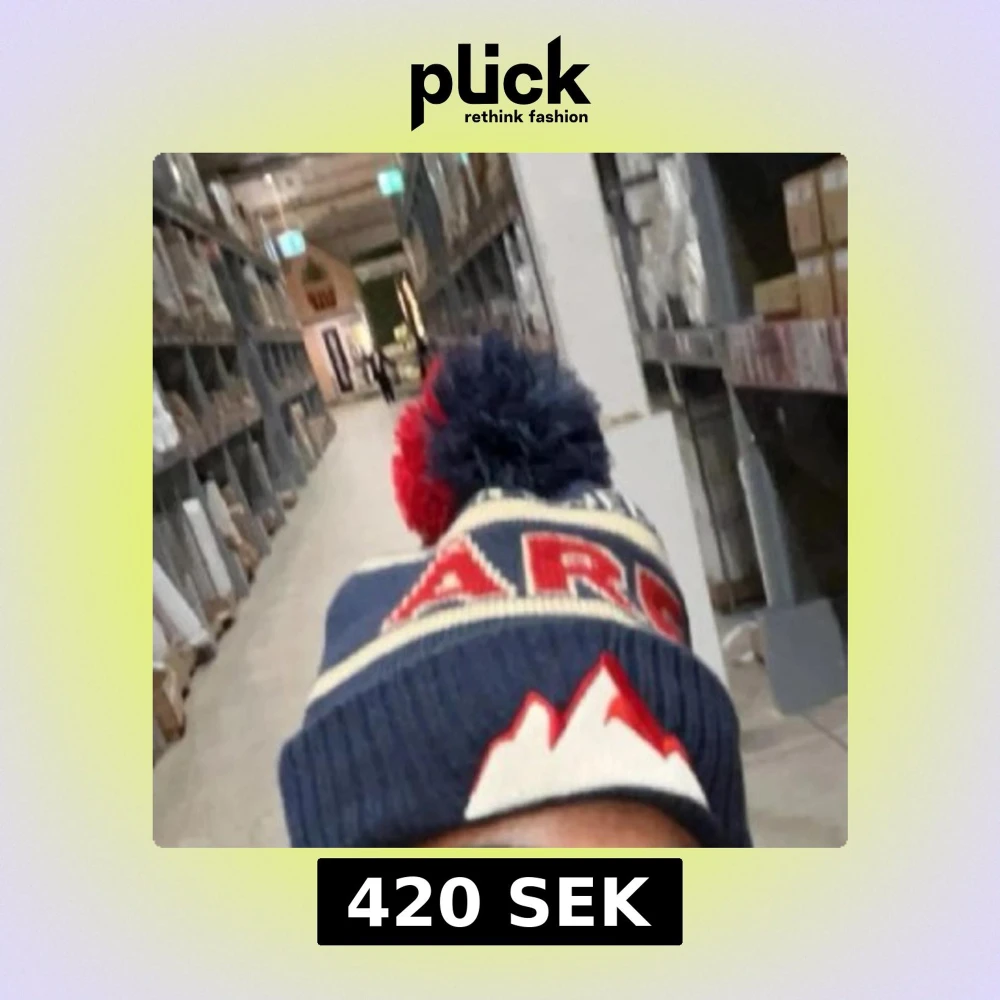Säljer en stickad blå åre mössa med stor tofs i blått och rött. Mössan har ett coolt bergmotiv framtill och text i rött och vitt. Perfekt för kalla dagar och snygg detalj till vinterlooken.