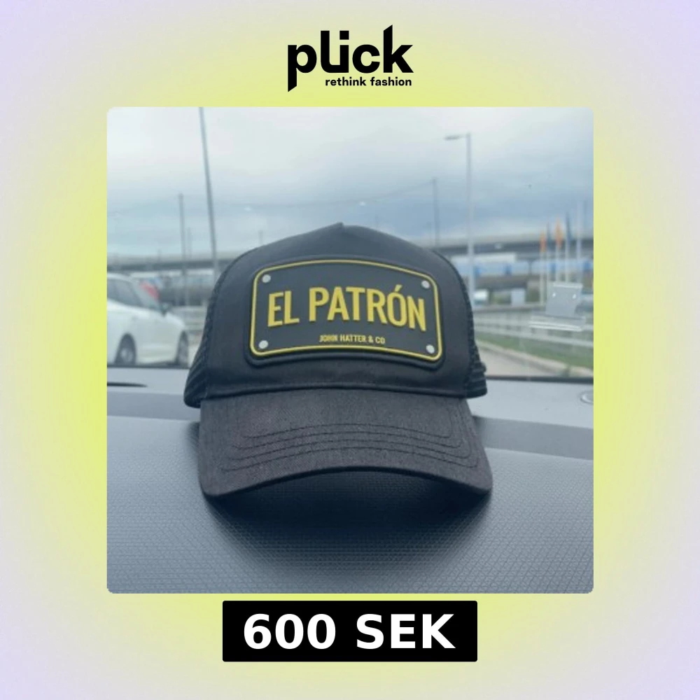Svart truckerkeps från John Hatter & Co med stor gul text 'EL PATRÓN' på en metallskylt framtill. Kepsen har böjd skärm och mesh på sidorna och bak för extra ventilation. Snygg och edgy design som sticker ut.
