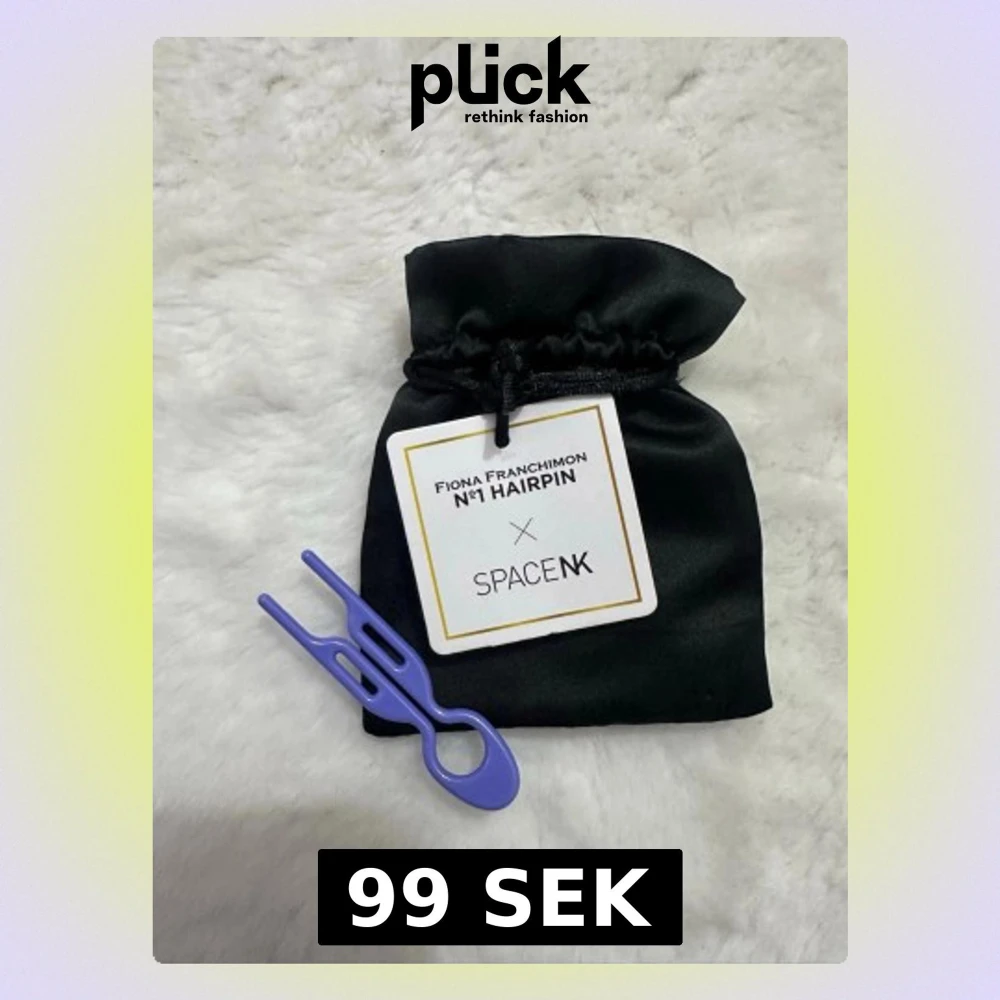 Bilden visar en hårnål från Fiona Franchimon x SpaceNK i en svart satinpåse, men ingen väst syns på bilden.
