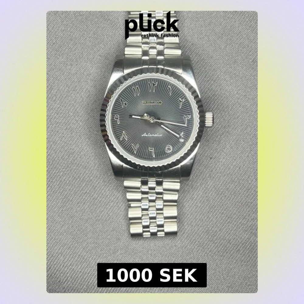 Bilderna visar en Seiko automatisk klocka i rostfritt stål med arabiska siffror på urtavlan och länkarmband. Ingen väst syns på bilderna. Glow in the dark