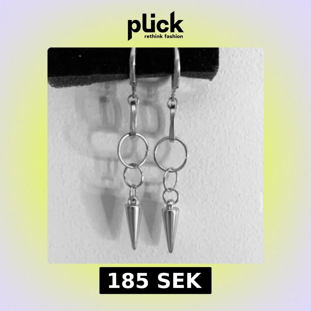 Coola silvriga örhängen med två ringar och en hängande konformad detalj längst ner. De har en modern och edgy vibe, perfekta för att lyfta din stil. Passar dig som gillar unika accessoarer med attityd.