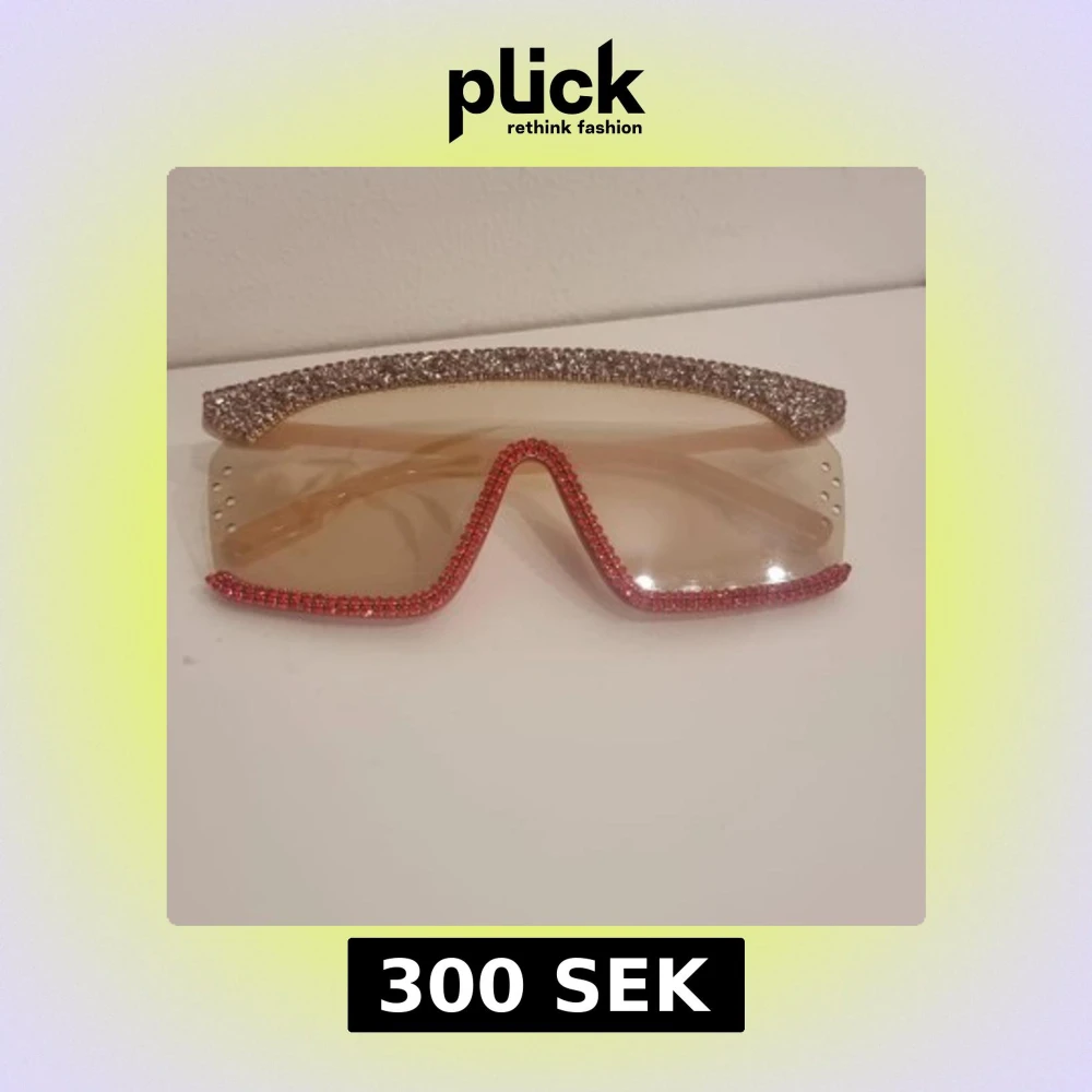 Unika solglasögon med stora, beige tonade linser och glittriga detaljer. Överdelen är täckt av silverfärgade stenar och nederdelen har röda stenar som ramar in glaset. Perfekt accessoar för dig som vill sticka ut.