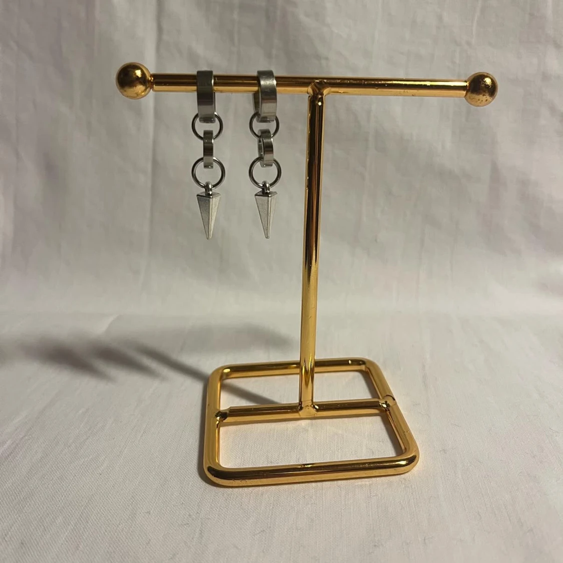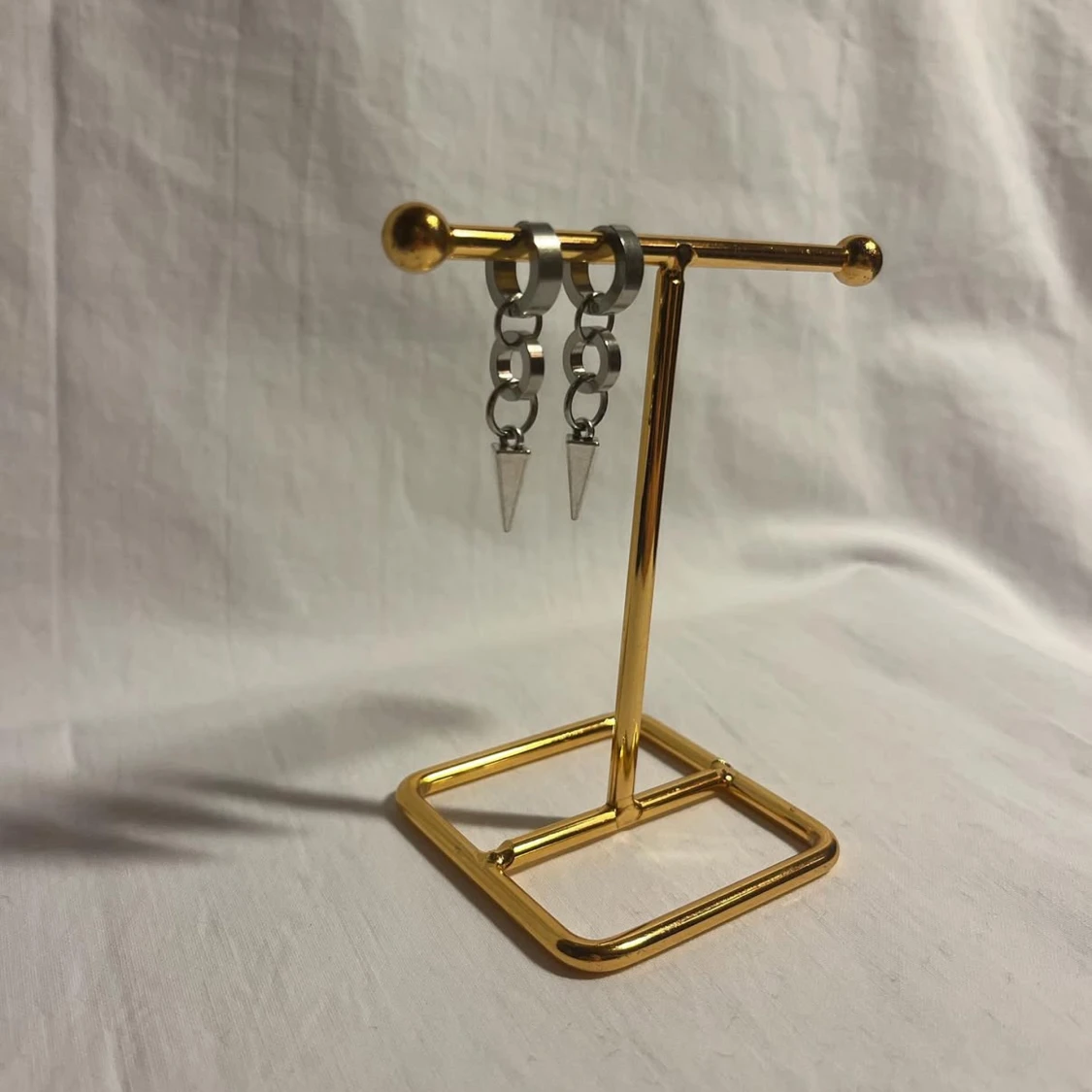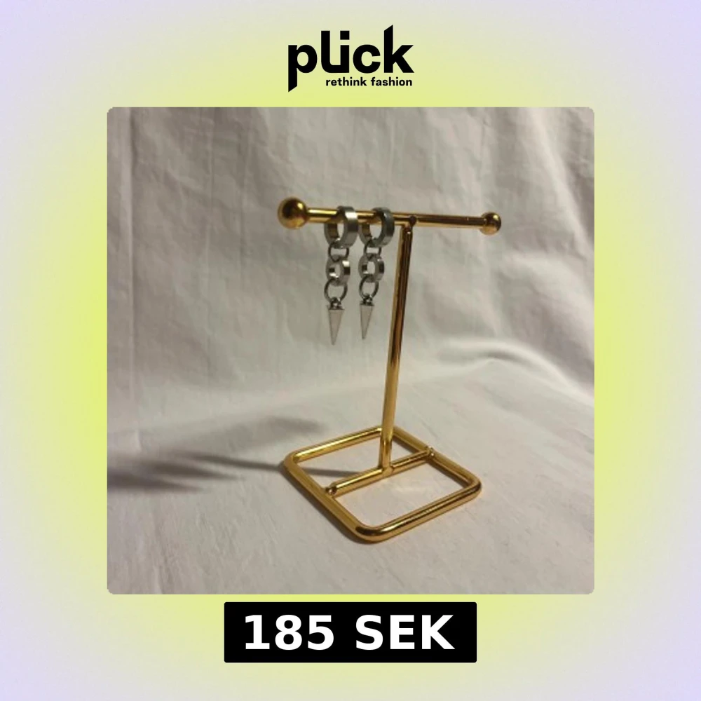 Coola silvriga örhängen med två kedjelänkar och spetsiga spikes längst ner. De har en modern och edgy vibe, perfekta för att lyfta din stil. Örhängena är i metall och har en minimalistisk men ändå tuff design.