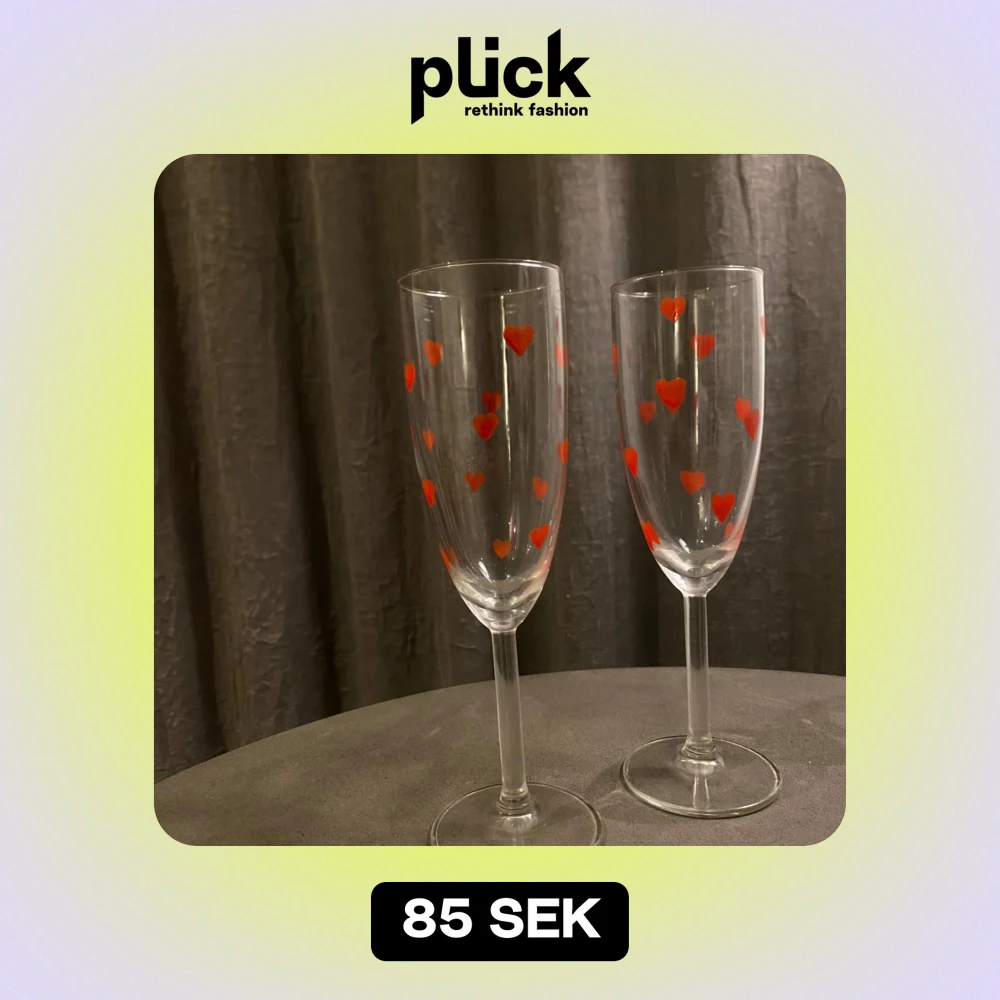 Säljer två supersöta champagneglas dekorerade med röda hjärtan. Perfekta för romantiska tillfällen eller som en gullig present. 85kr/styck eller 2 för 150kr