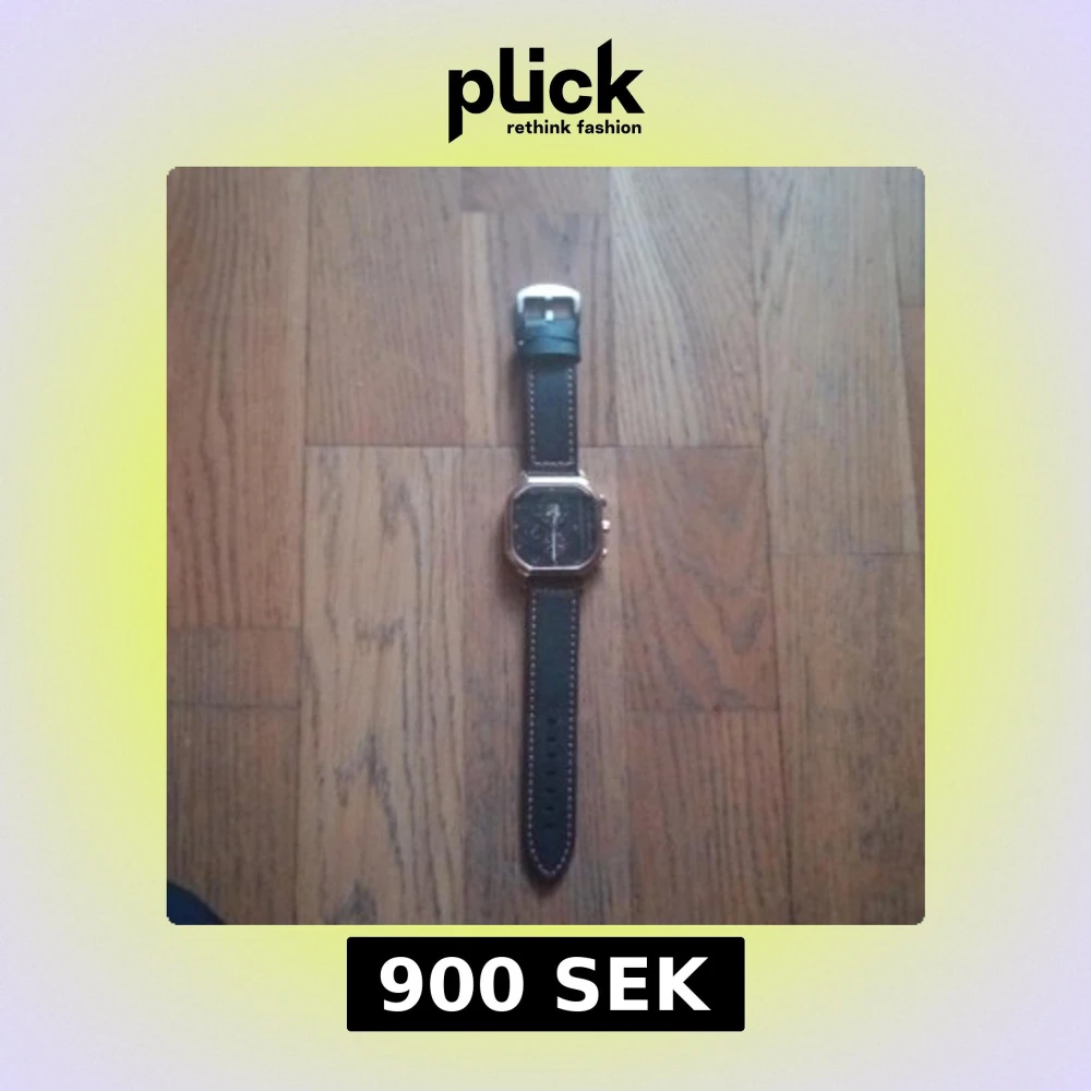 Snygg klocka med svart läderarmband och fyrkantig urtavla i guld. Urtavlan har detaljer i svart och guld med flera visare och en datumvisare. Perfekt accessoar för den stilmedvetne.