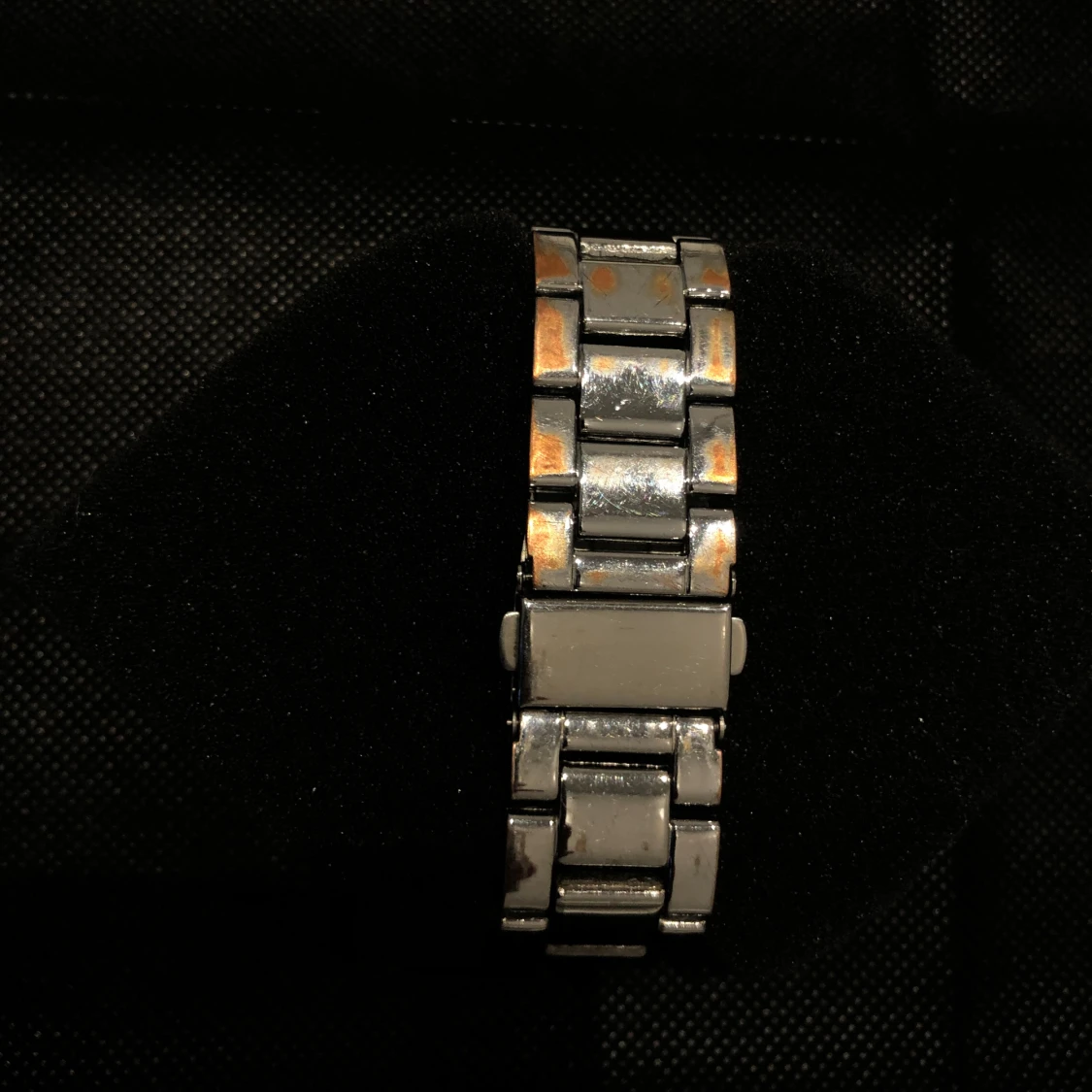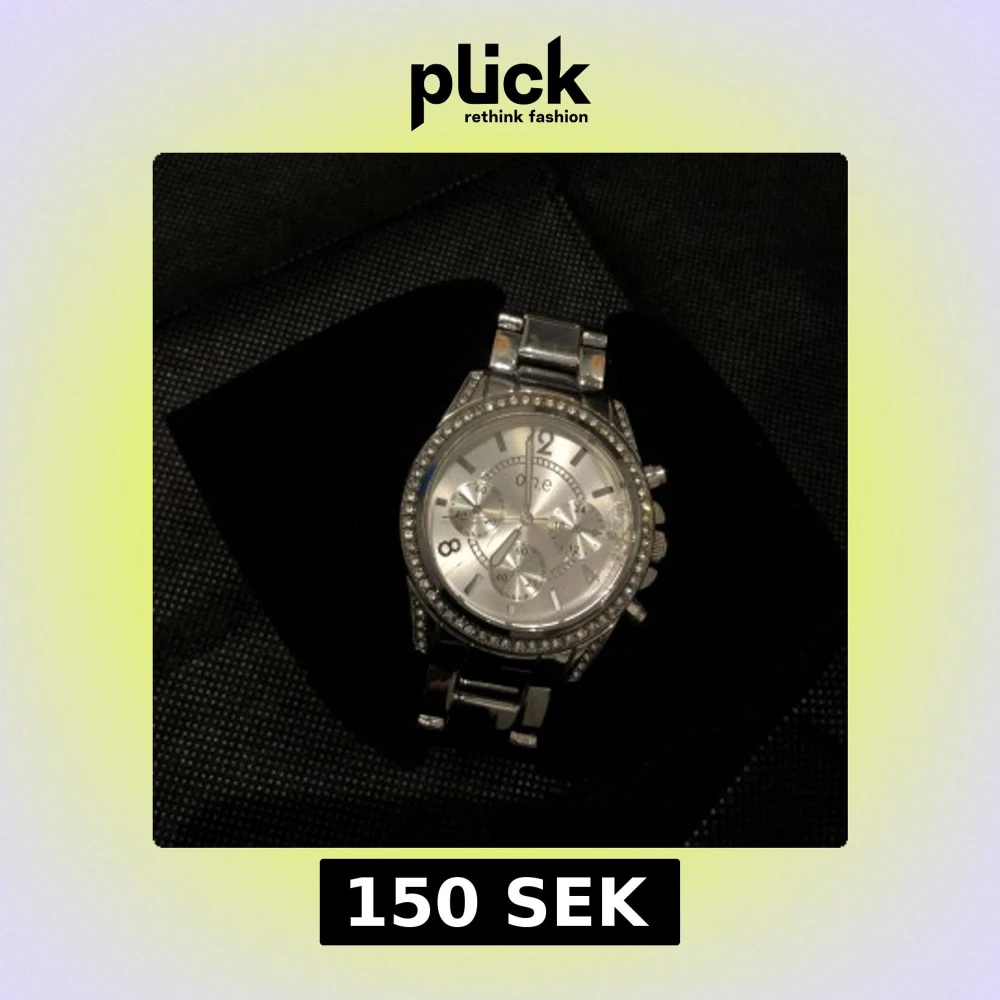 Elegant silverfärgad klocka från One med strass runt urtavlan. Klockan har en metallarmband och flera små urtavlor inuti. Perfekt för att ge en glittrig touch till din outfit. Har börjat rosta och har en lite större skrapa på en sida.