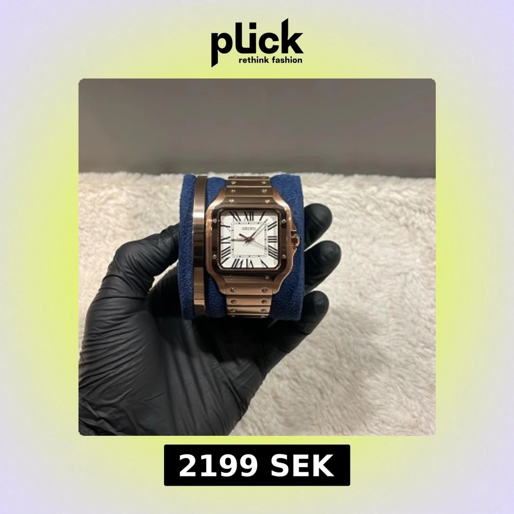 Elegant guldfärgad klocka från Seiko med fyrkantig urtavla och romerska siffror. Klockan har en stilren design med metallarmband och synliga skruvar på boetten. Perfekt för den som vill ha en tidlös accessoar.