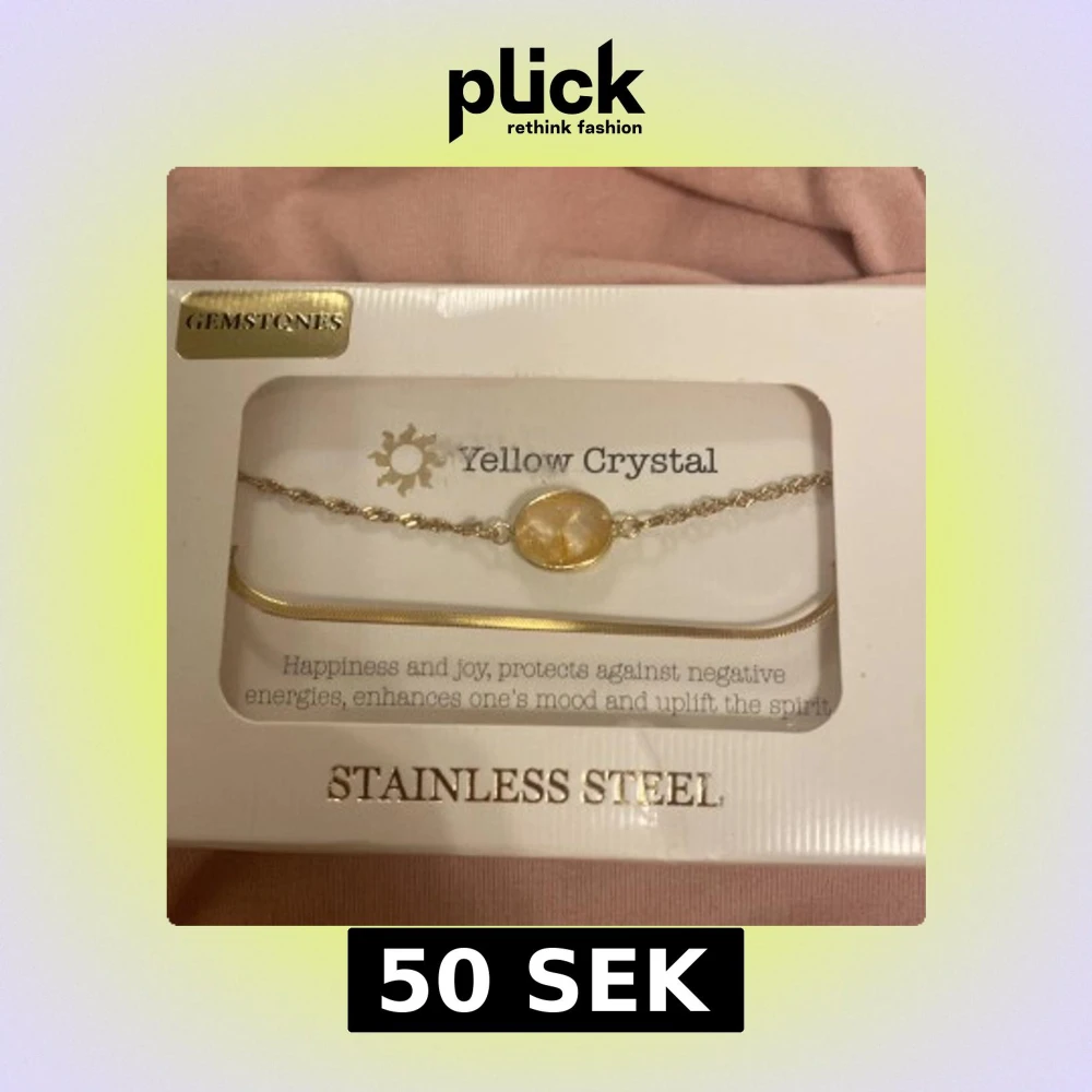 Snyggt armband i guldtonad stainless steel med en oval gul kristall i mitten. Kedjan är tunn och elegant, perfekt för att ge lite extra glow till din stil. Kristallen ger en unik touch och fångar ljuset superfint. Färgen går inte bort