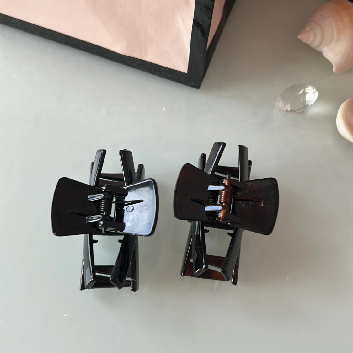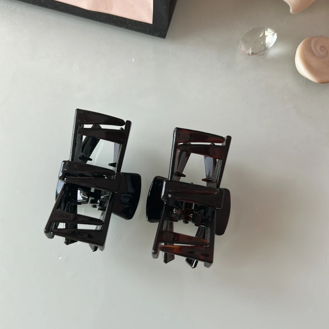 Två coola hårklämmor i svart och mörkbrun plast med stilren, geometrisk form. Perfekta för att snabbt fixa frisyren och hålla håret på plats. Passar både till utsläppt och uppsatt hår, och är lätta att använda tack vare den starka fjädern.