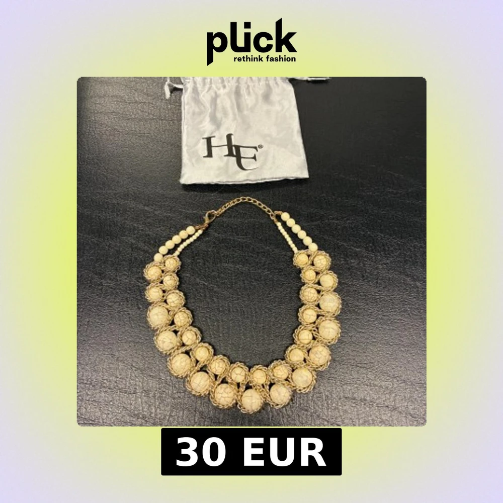 Unikt statementhalsband från House of Elliot med stora beige pärlor i marmorerad look, inramade av tvinnade guldfärgade kedjor. Halsbandet har justerbar kedja och stängs med karbinhake. Kommer med en snygg silvrig förvaringspåse med logga.