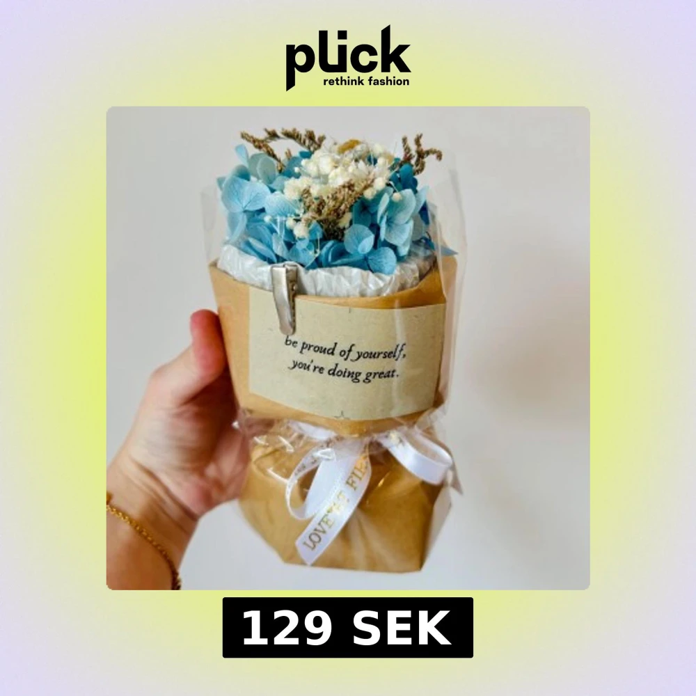 . Dekorerad med blå och vita torkade blommor samt ett vitt band med texten 'LOVE'. Perfekt som present eller peppande gåva.