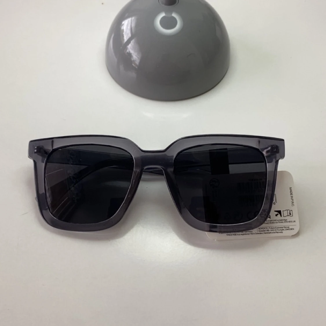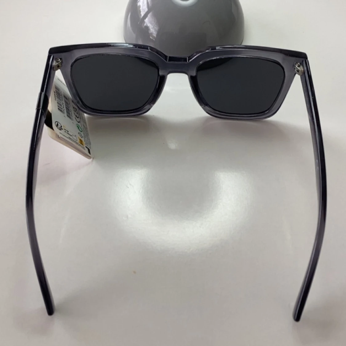Snygga solglasögon med bred, fyrkantig båge i transparent svart plast. Glasen är mörka och ger ett coolt, stilrent intryck. Perfekta för att lyfta din look under soliga dagar. Liknar CHIMI solglasögon