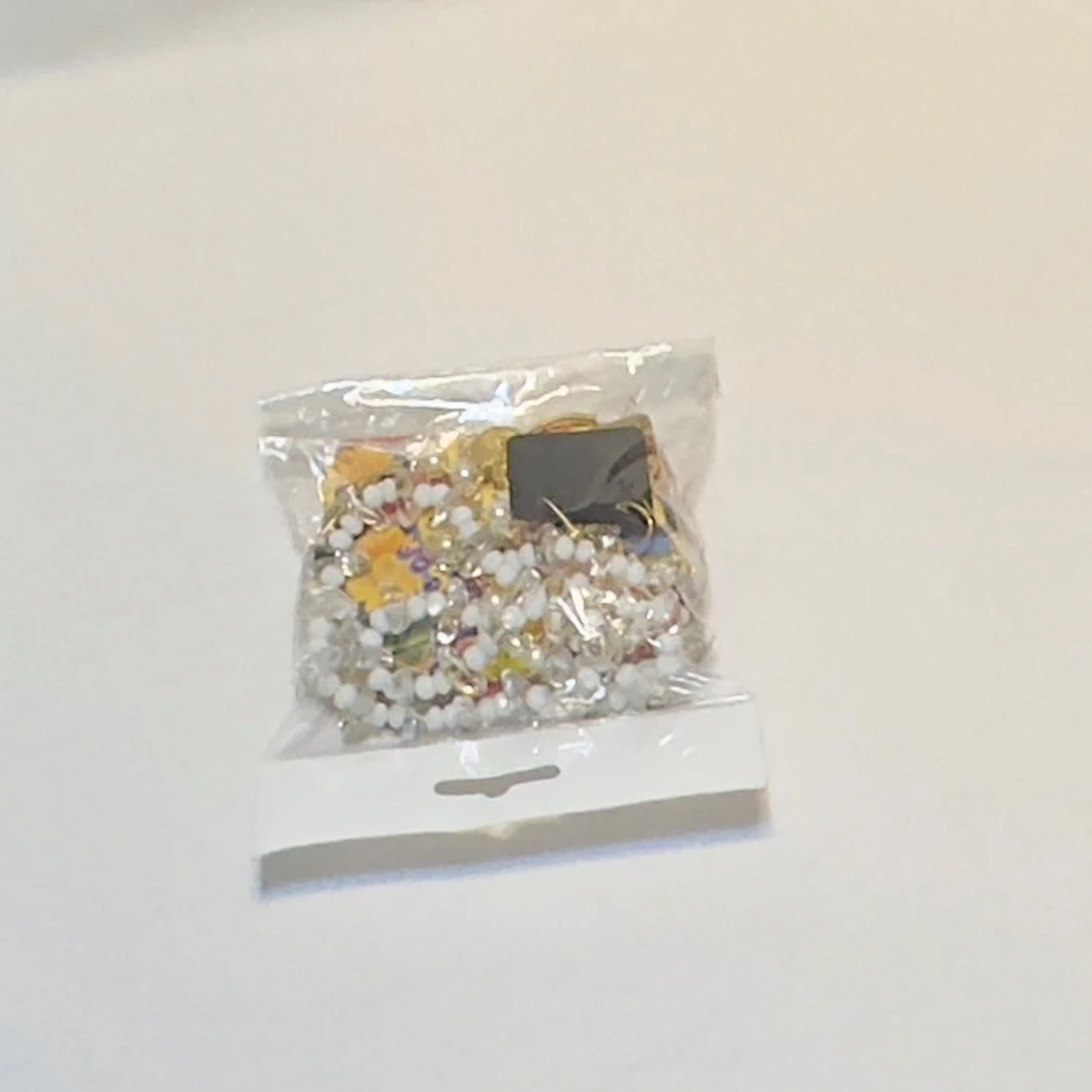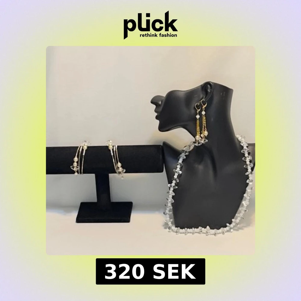 Elegant smyckeset med halsband, armband och örhängen. Halsbandet har klara kristaller och vita pärlor. Armbanden är dekorerade med vita pärlor och gulddetaljer. Örhängena är långa med guldkedjor och pärlor.Ett par örhängen och ett par armband plus en halsband handgjorda mycket mycket fint nytt oanvänd vit