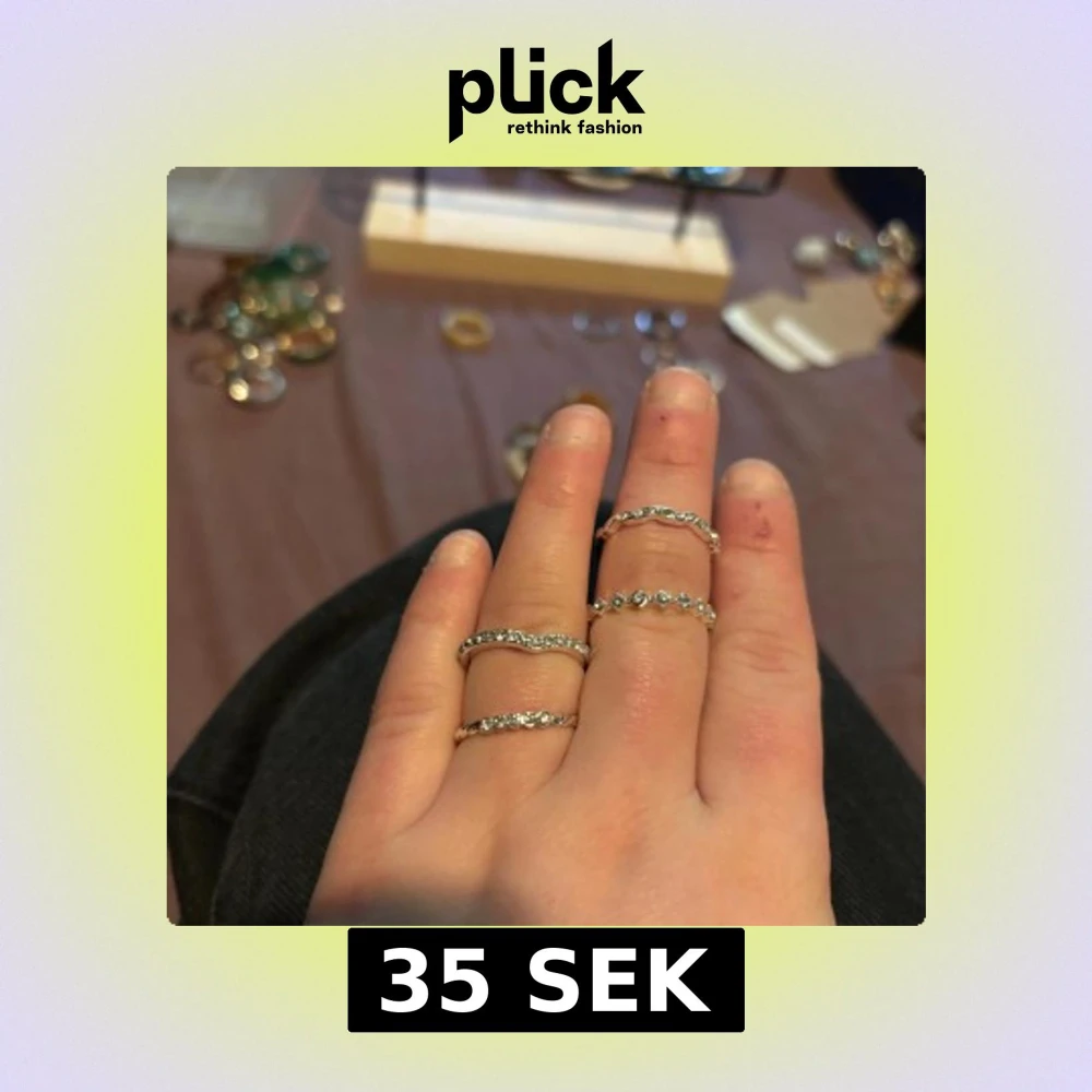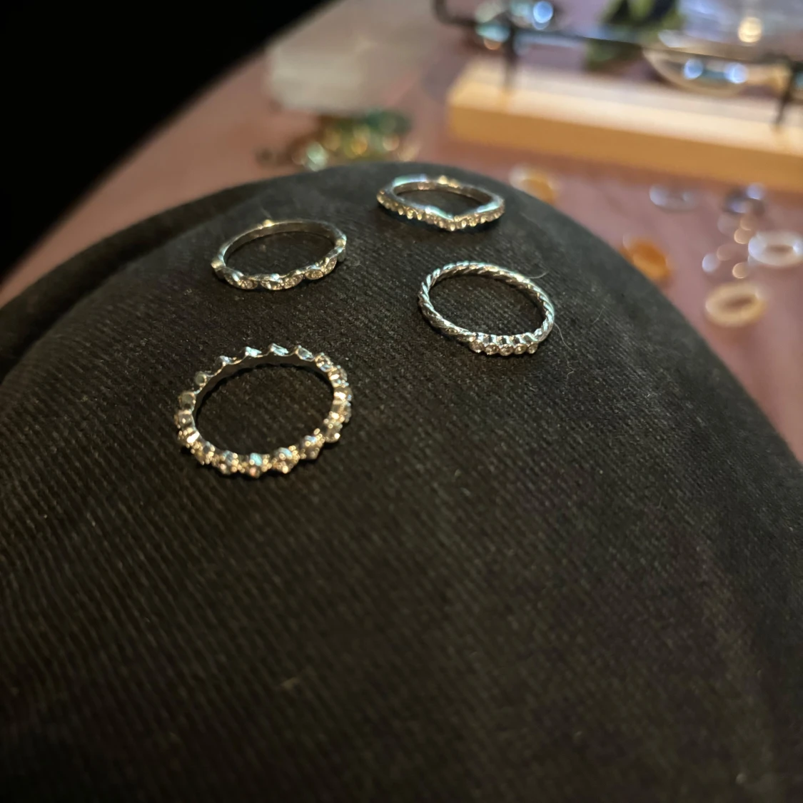 Fyra tunna silvriga ringar med glittrande stenar runt hela bandet. Några av ringarna har vågig form och andra är raka, vilket ger en snygg mixad look. Perfekta att bära tillsammans eller var för sig för en trendig vibe.