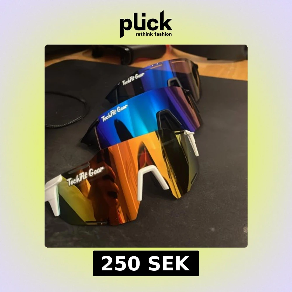 Säljer flera par sportiga TechFit Gear-glasögon med spegelglas i blått, gult/orange och svart. Modellen har en modern, kantig form och breda bågar i svart eller vitt. Perfekta för cykling eller träning, med lätta och tåliga syntetbågar.